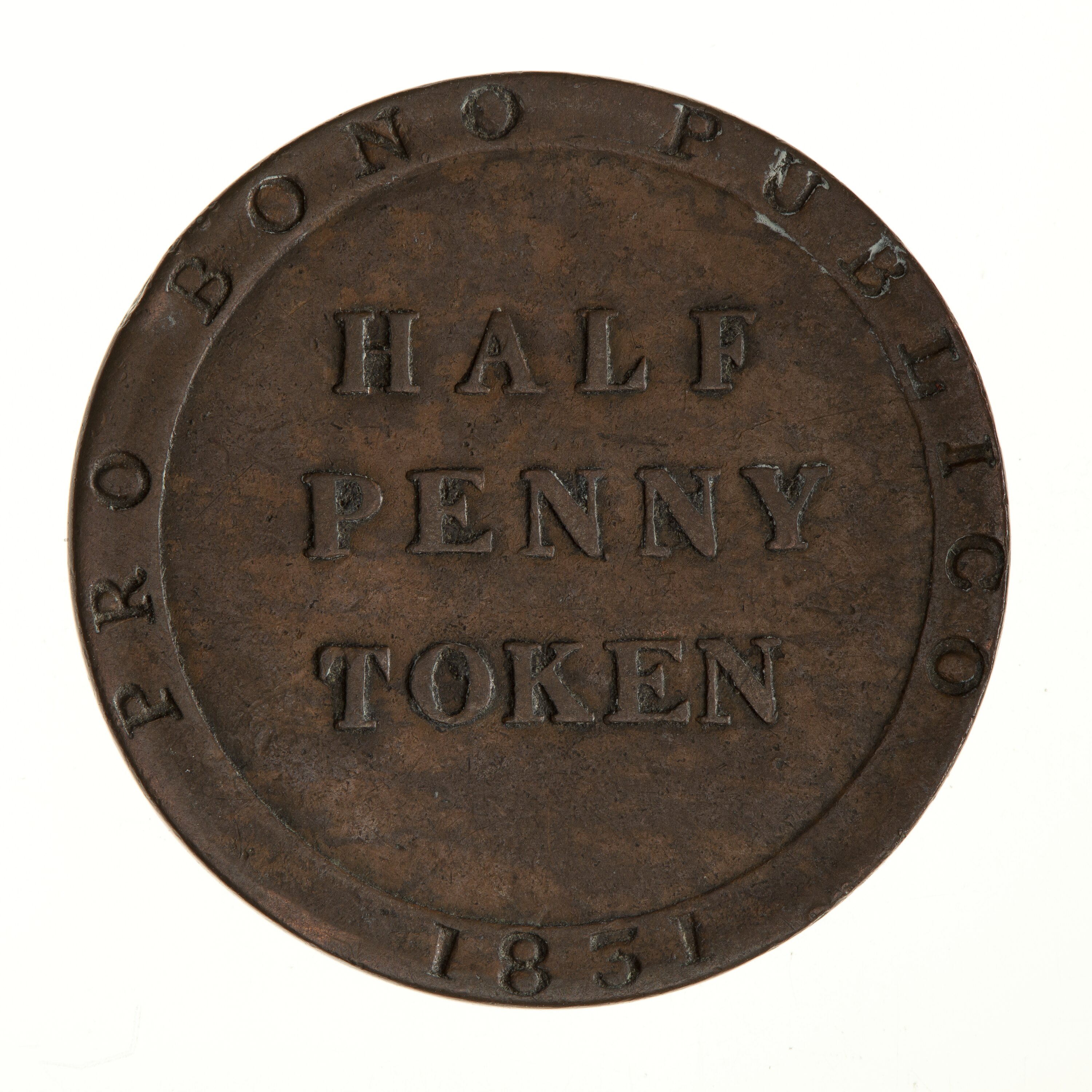 At centre, HALF / PENNY / TOKEN; around incuse on broad rim, PRO BONO PUBLICO 1831