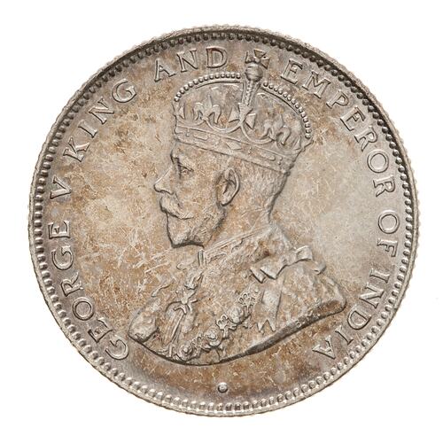 Crowned and draped bust of the King facing left, the King is wearing the Imperial Crown and the ermine Robe of State, the Collar of the Most Noble Order of the Garter, and the Badge of the Most Honourable Order of the Bath; around, GEORGE V KING AND EMPEROR OF INDIA; on bust truncation, the artist's initials, BM