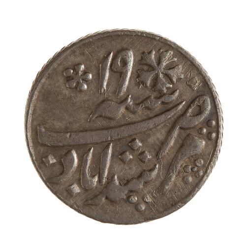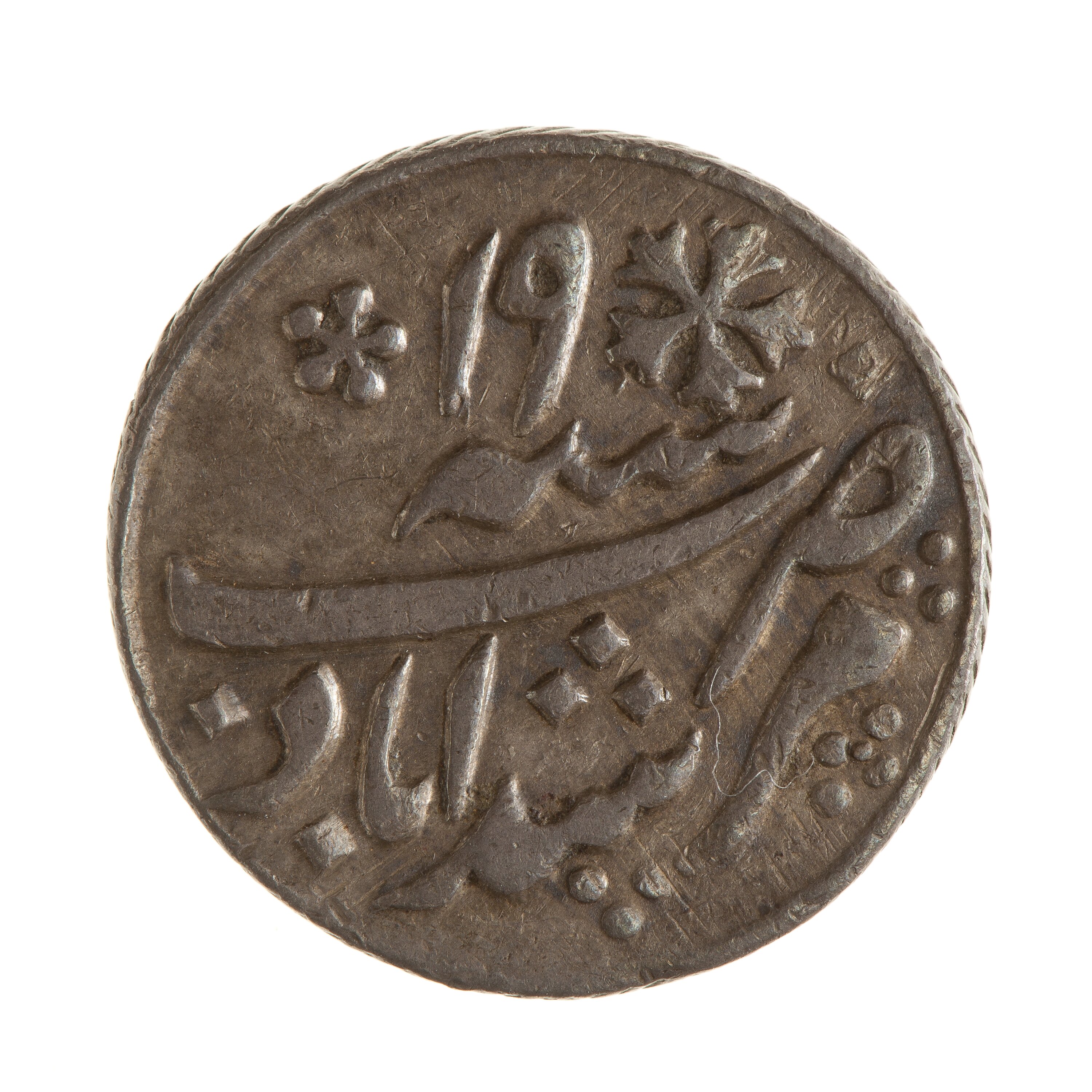 The 1793 issue was authorised under Regulation XXXV of 1 May 1793. Except on the 1/4 rupee, the hijri year is omitted from the legend, on the 1/4 rupee it was given as 1204 (1789-1790 AD). The mints of Calcutta, Dacca, Murshidabad and Patna were used to strike coins for this issue, all are identicle except for tiny (secret) dots; in this case a dot in the middle of the four beads near the rim at 4 o'clock on the reverse.