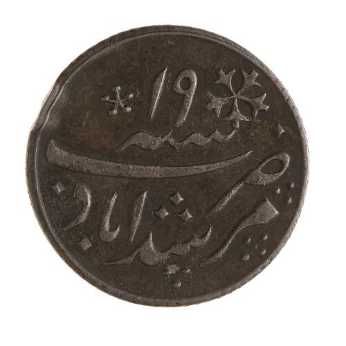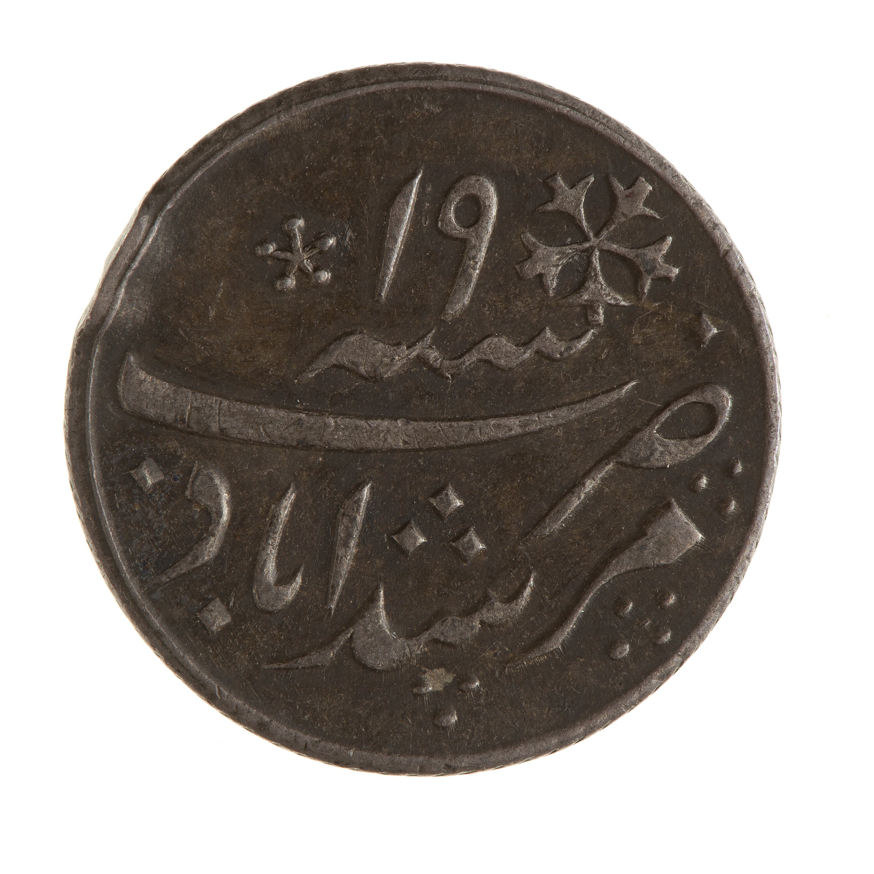 The 1793 issue was authorised under Regulation XXXV of 1 May 1793. Except on the 1/4 rupee, the hijri year is omitted from the legend, on the 1/4 rupee it was given as 1204 (1789-1790 AD). The mints of Calcutta, Dacca, Murshidabad and Patna were used to strike coins for this issue, all are identicle except for tiny (secret) dots; in this case a dot in the middle of the four beads near the rim at 4 o'clock on the reverse.