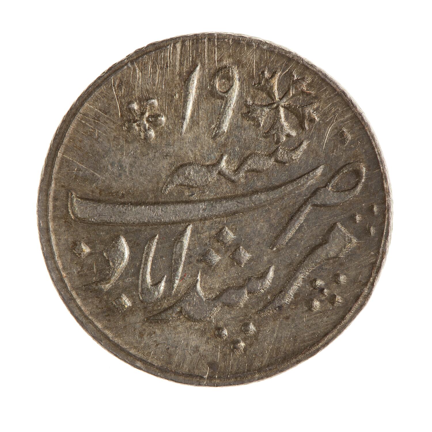 The 1793 issue was authorised under Regulation XXXV of 1 May 1793. Except on the 1/4 rupee, the hijri year is omitted from the legend, on the 1/4 rupee it was given as 1204 (1789-1790 AD). The mints of Calcutta, Dacca, Murshidabad and Patna were used to strike coins for this issue, all are identicle except for tiny (secret) dots; in this case a dot in the middle of the four beads near the rim at 4 o'clock on the reverse.