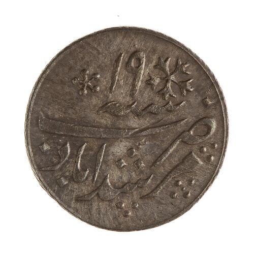 The 1793 issue was authorised under Regulation XXXV of 1 May 1793. Except on the 1/4 rupee, the hijri year is omitted from the legend, on the 1/4 rupee it was given as 1204 (1789-1790 AD). The mints of Calcutta, Dacca, Murshidabad and Patna were used to strike coins for this issue, all are identicle except for tiny (secret) dots; in this case a dot in the middle of the four beads near the rim at 4 o'clock on the reverse.