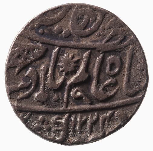 Persian legend, partly off flan (Translation: Pridmore 13 - Struch at the Banaras mint in the 49th year of his reign of tranquil prosperity)