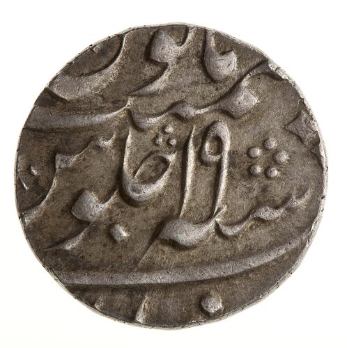 Persian couplet (mostly off flan) with the date 120 (2 or 3); Pridmore translation: "Defender of the religion of Mohammad. Shah 'Alam. Emperor. Shadow of the divine favour, put his stamp on the seven climes"