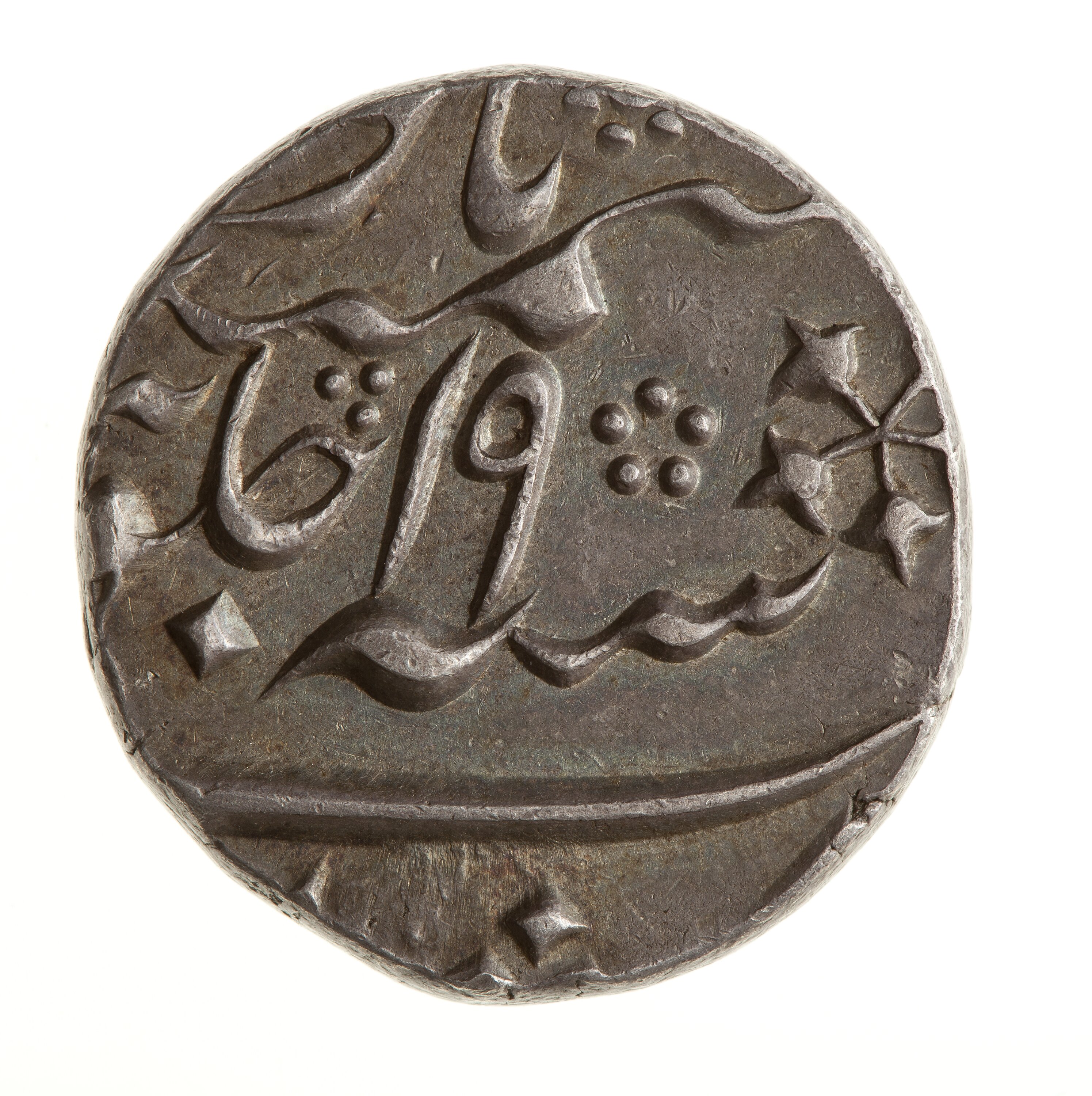 Persian couplet (mostly off flan) with the date off the flan; Pridmore translation: "Defender of the religion of Mohammad. Shah 'Alam. Emperor. Shadow of the divine favour, put his stamp on the seven climes"