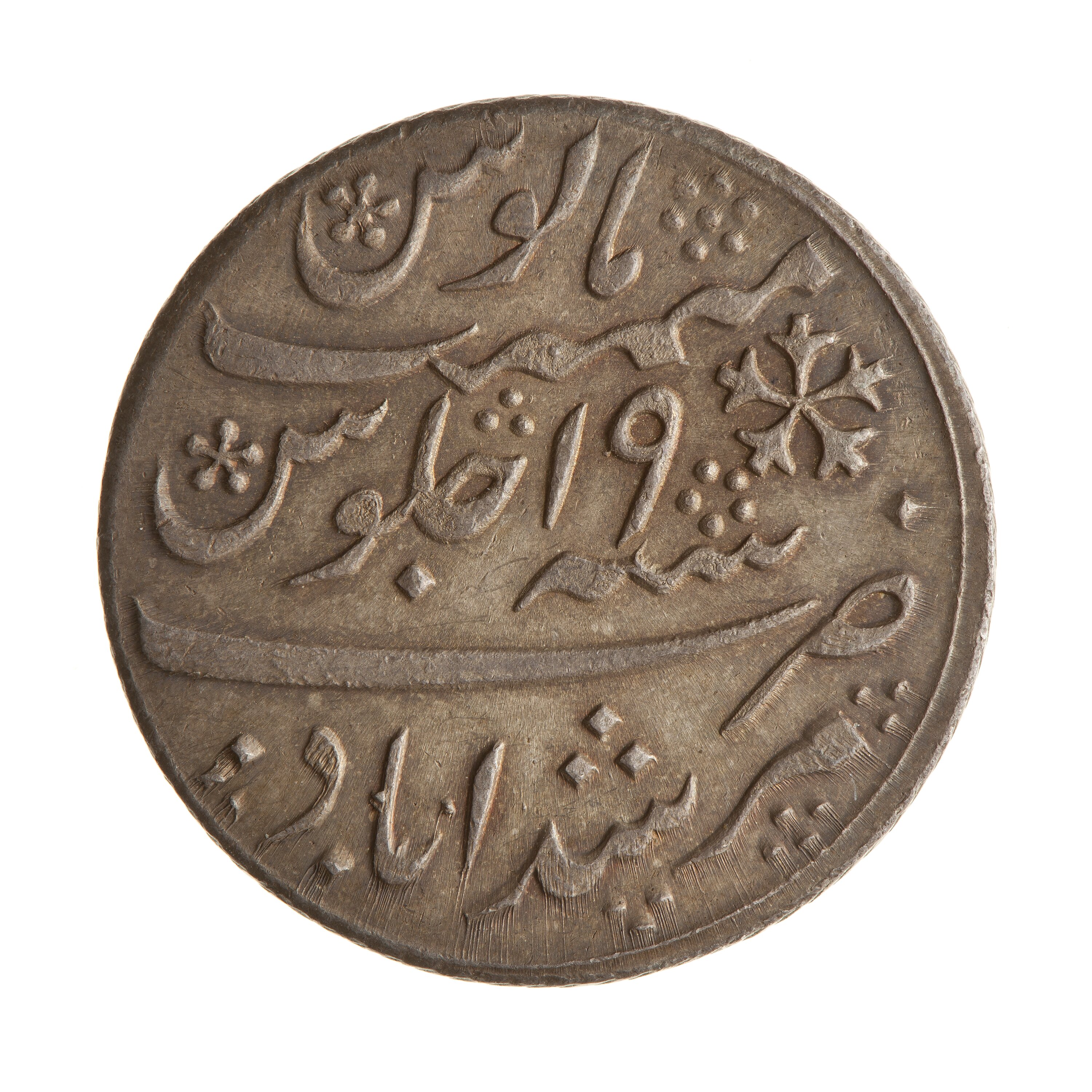 Julus formula legend (translation: Struck at the Murshidabad mint in the year 19 of his reign of tranquil prosperity)