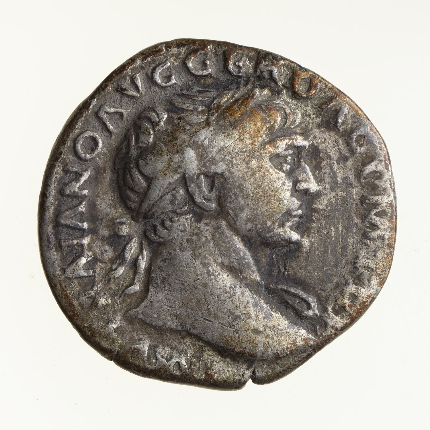 Laureate head of Trajan facing right, drapery on left shoulder; around, IMP TRAIANO A[VG GER DAC PM TR P]