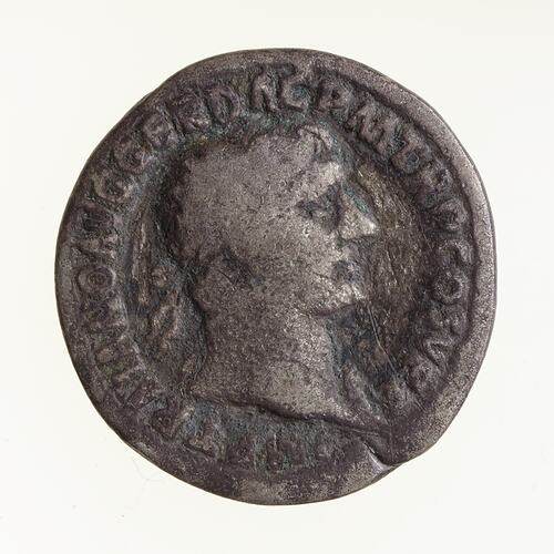 Laureate head of Trajan facing right, drapery on left shoulder; around, IMP TRAIANO AVG GER DAC PM TR P COS V P P