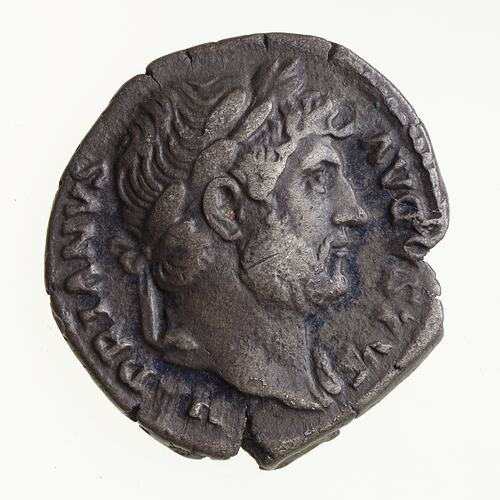 Laureate head of Hadrian facing right, drapery on left shoulder; around, HADRIANVS AVGVSTVS
