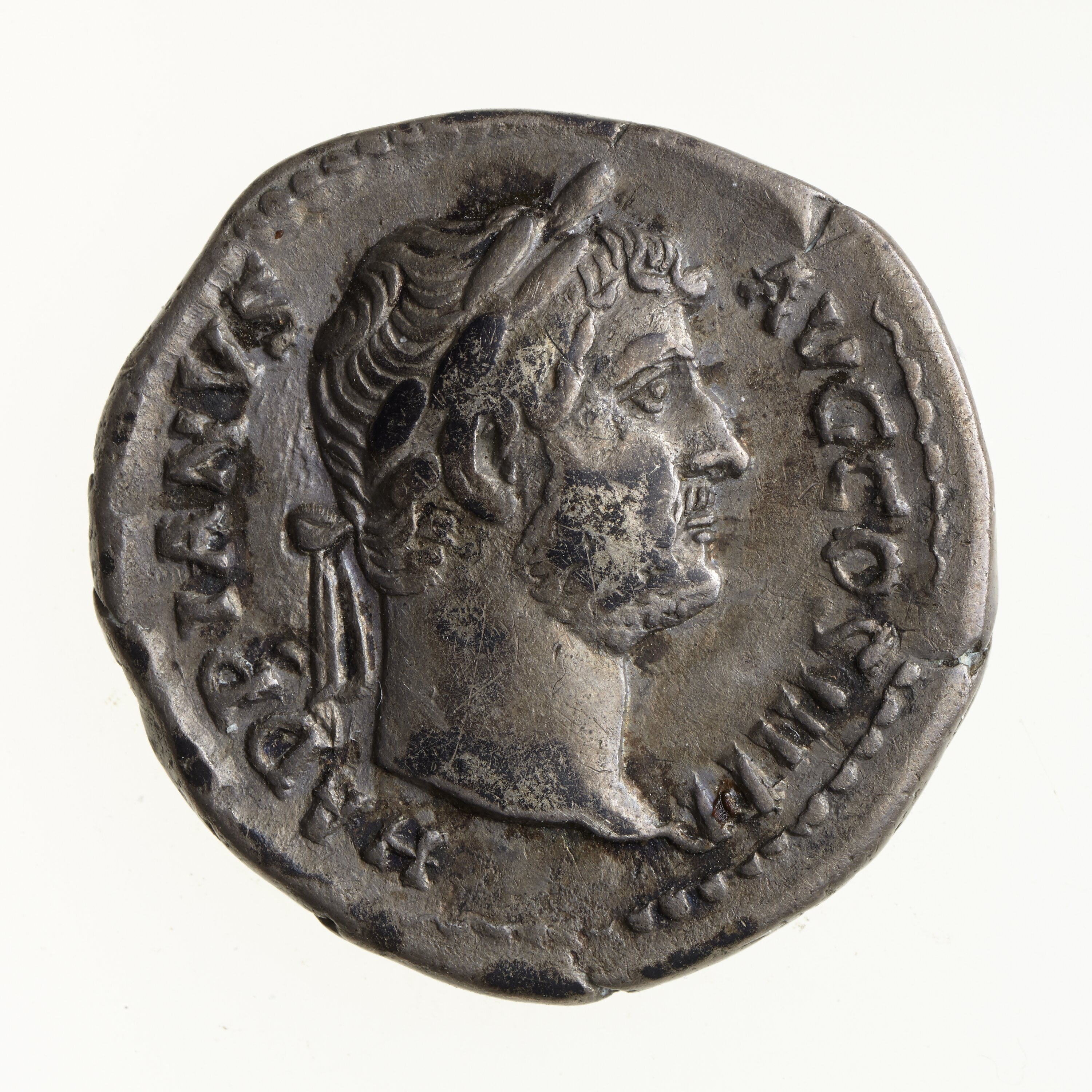 Laureate head of Hadrian facing right; around, HADRIANVS AVG COS III P P