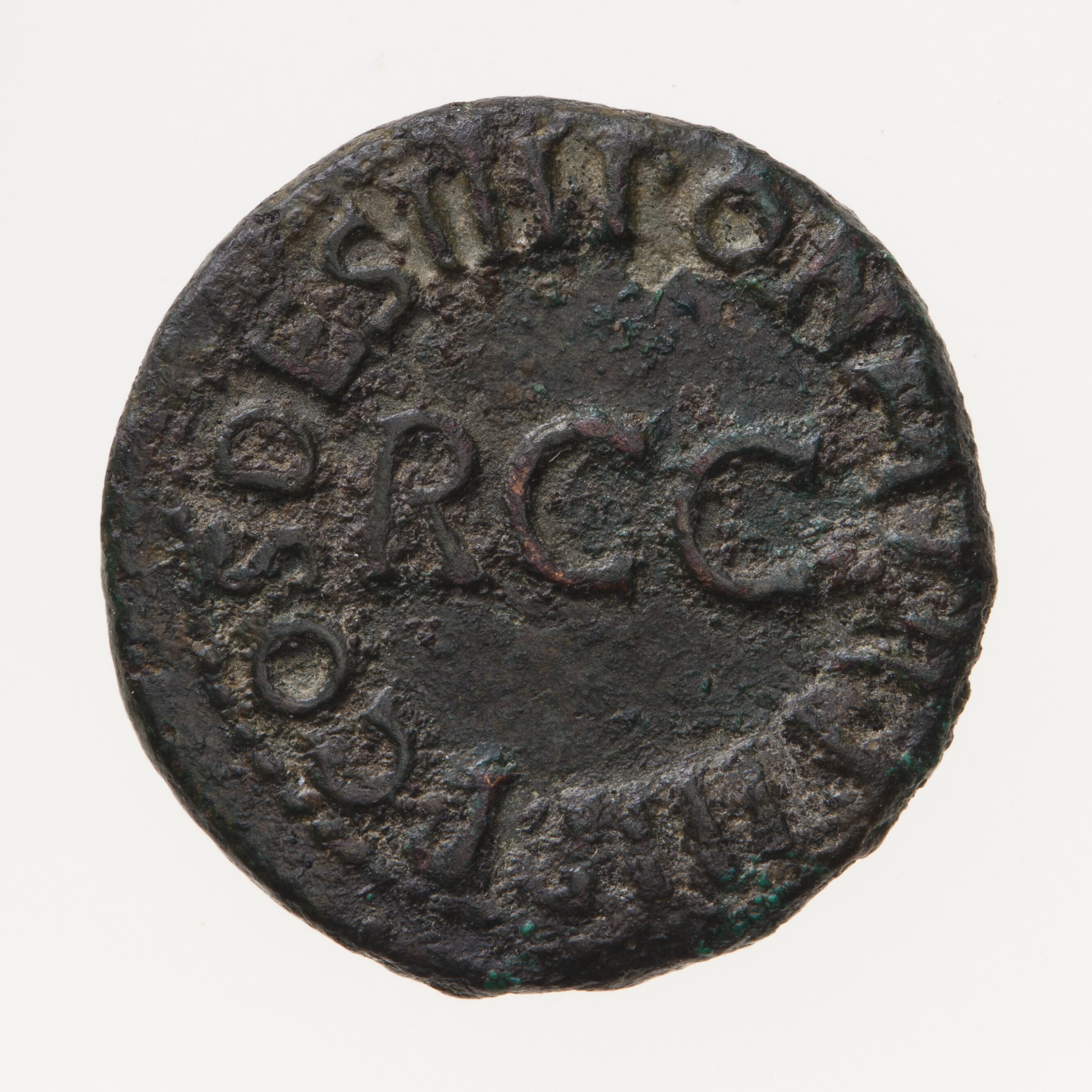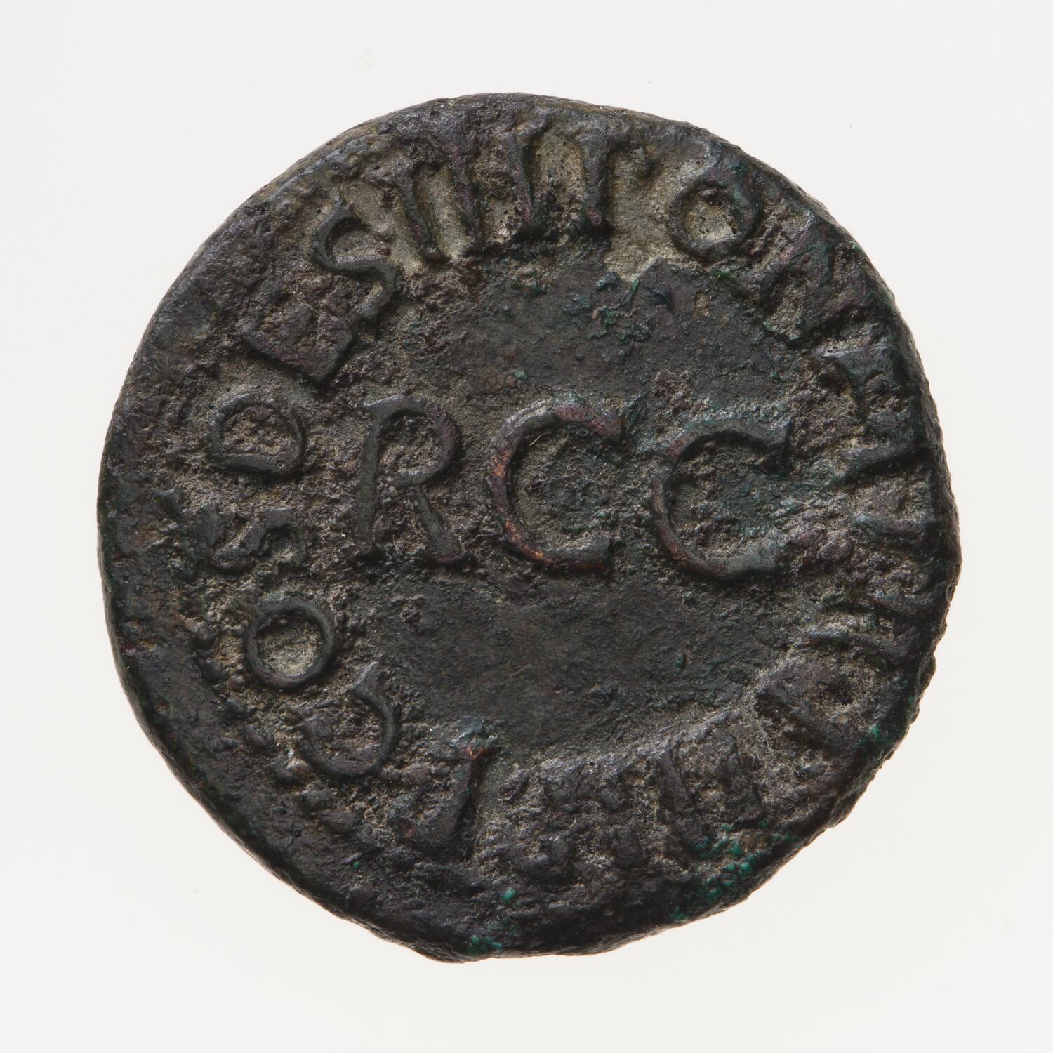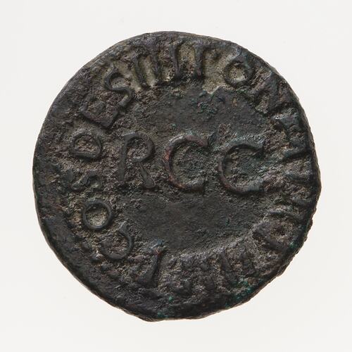 Quadrans struck during the reign of Gaius (known by the nickname Caligula) in 39 AD, Ancient Roman Empire. Minted by Rome. The rim legend on the reverse is a continuation of the obverse. The letters RCC at the centre record the remission of a tax of 1/2 % on sales (remissa ducentesima)