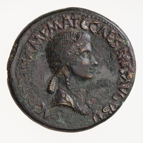 Draped bust of Agrippina facing right; around, AGRIPPINA M F MAT . C CAESARIS AVGVSTI