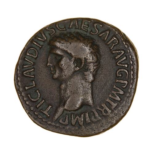 Copper As of Claudius, Ancient Roman Empire, probably struck in the period 41 to 50 AD but production could have continued a little longer. Minted by Rome. Although the gold and silver coins of Claudius show numerical changes in TRP and IMP which can be translated to dates, the aes coinage is almost unchanged (with the exception of the addition of PP in 50 AD). This coin, with no PP at the end of the obverse legend is therefore only broadly dated to between 41 and 50 AD.