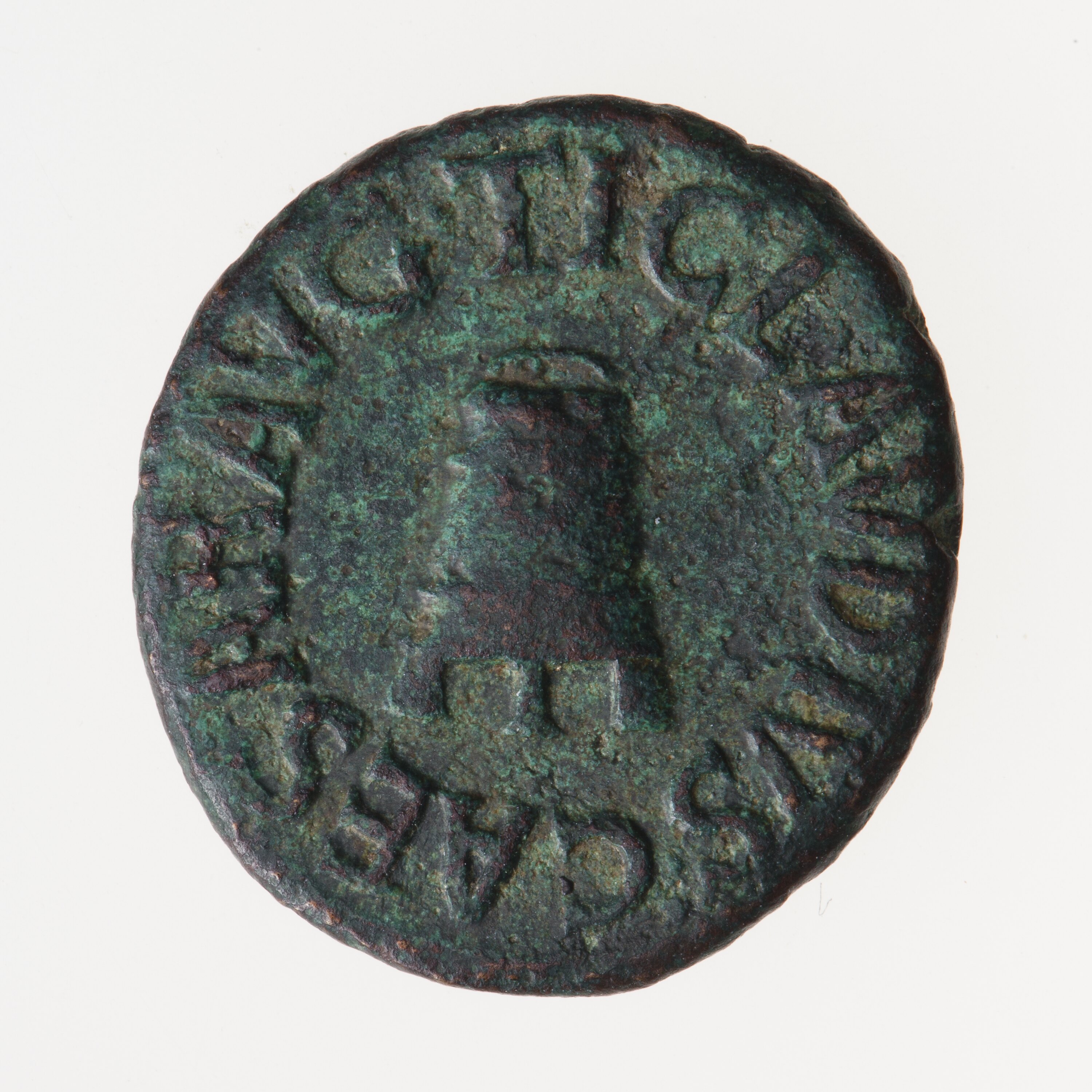 Quadrans struck in the period 5 January 42 AD to 31 December 42 AD, Ancient Roman Empire. Minted by Rome. The use of the modius on the obverse of this issue is thought to relate to distribution of corn to the citizens.