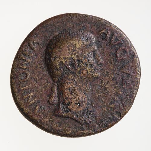 Orichalcum Dupondius struck by Claudius in the name of Antonia between 41 and 45 AD, Ancient Roman Empire. Minted by Rome. Antonia, depicted on the obverse of this coin, was the mother of Claudius. The daughter of Mark Anthony and Octavia she was born in Greece but brought up by her mother in Rome. She married Nero Claudius Drusus in 16 BC. She died in Rome in 37 AD. She had rejected the title Augusta (found on this coin) but was given it by Claudius in 41 AD some four years after her death.