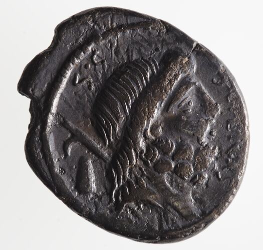 Bearded head of Saturn facing right, behind, a harpa (a sickle used for grain harvest and as a weapon) and a representation of the stone which Saturn swallowed believing it to be the child who grew up to be Jupiter; above, S.C; at right (tops of letters off flan), SVFENAS