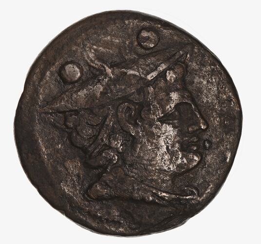 Head of the god Mercury wearing a winged petasus facing right; above, two beads, line border