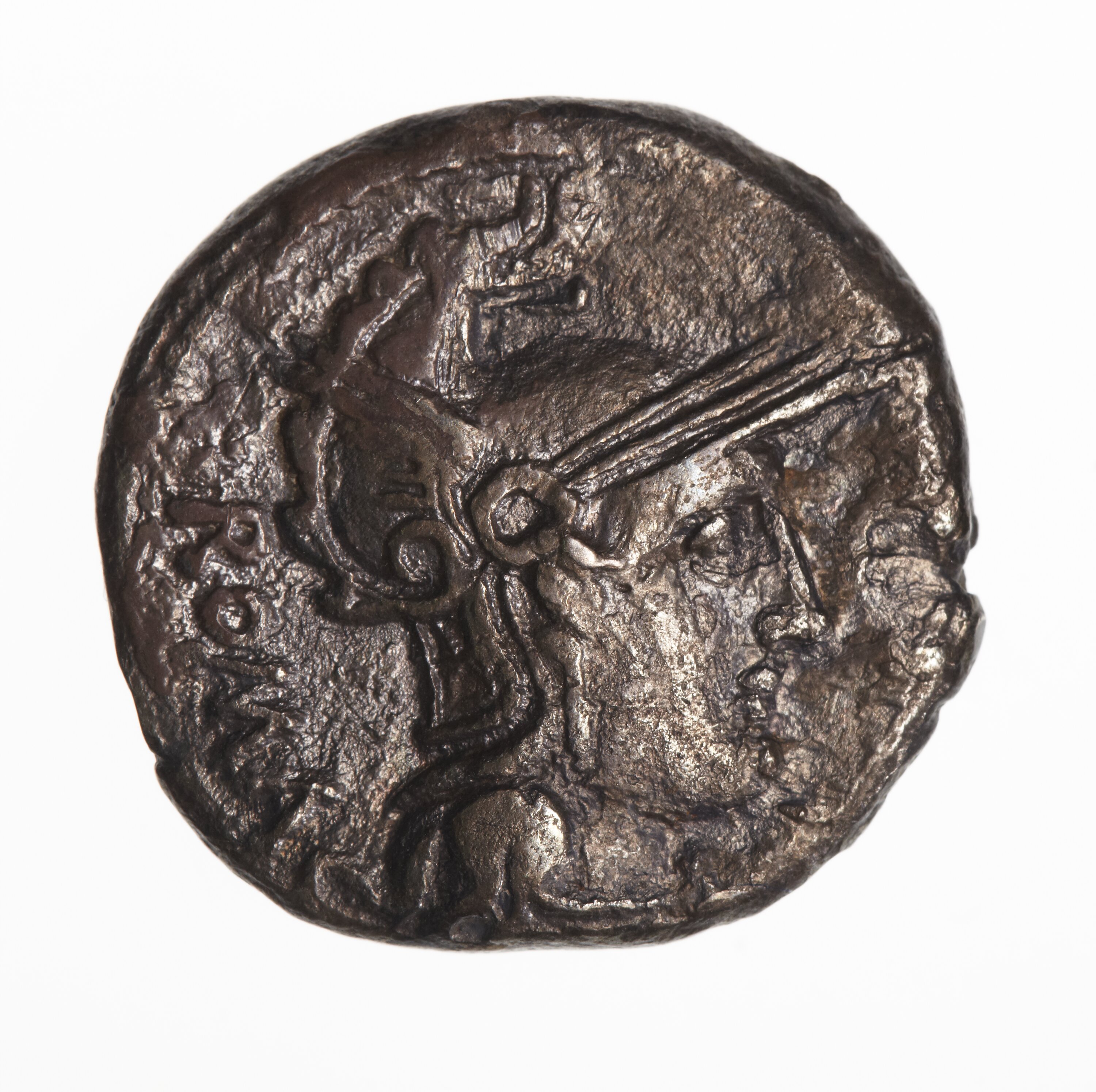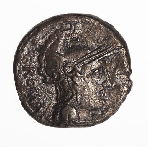 Head of Roma, wearing a Phrygian helmet, facing right; behind, ROMA; denomination mark off flan