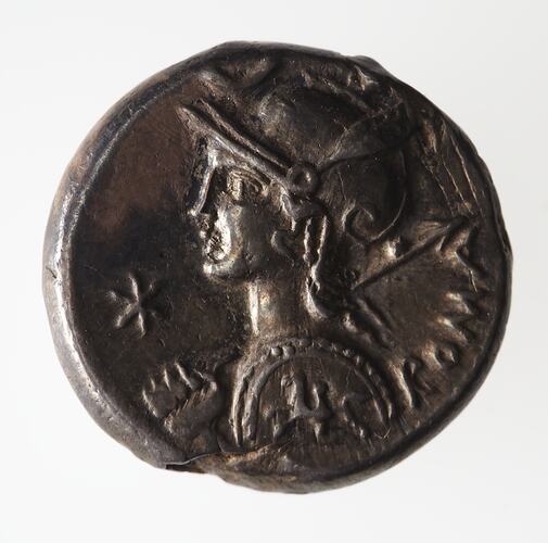 Helmeted bust of Roma facing left, shield on left shoulder and holding a spear over her right; above, a crescent; at left the denomination mark X with bar; at right, ROMA