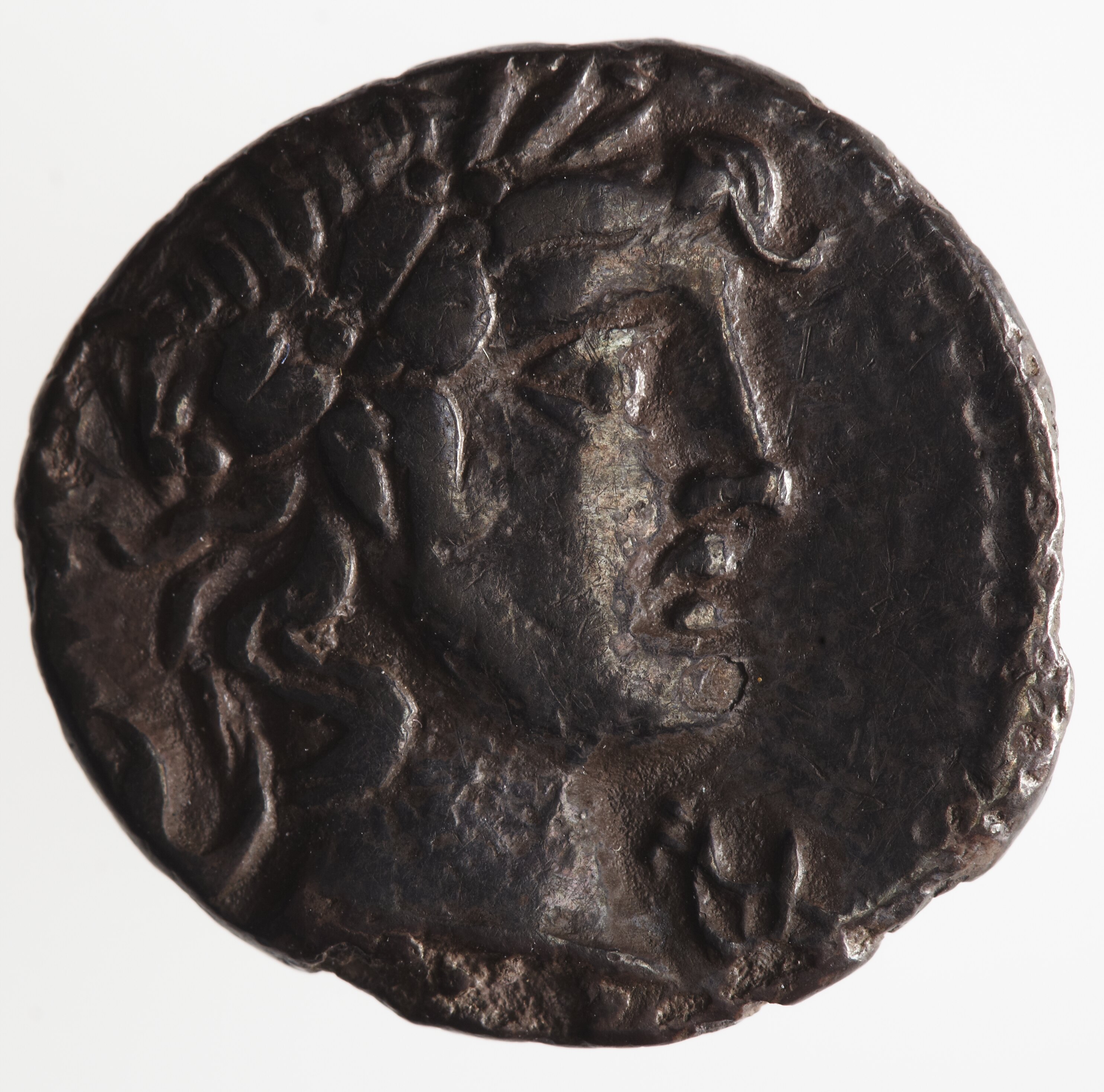 Laureate head of Apollo facing right, in field at right, a control mark; border of dots