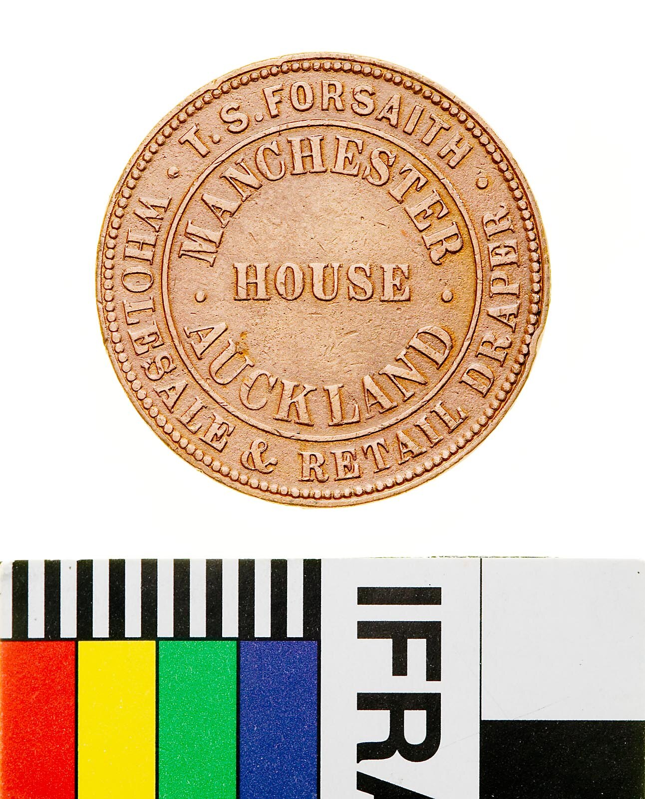 Obverse: T.S. FORSAITH MANCHESTER HOUSE AUCKLAND WHOLESALE & RETAIL DRAPER Reverse: NEW ZEALAND 1858