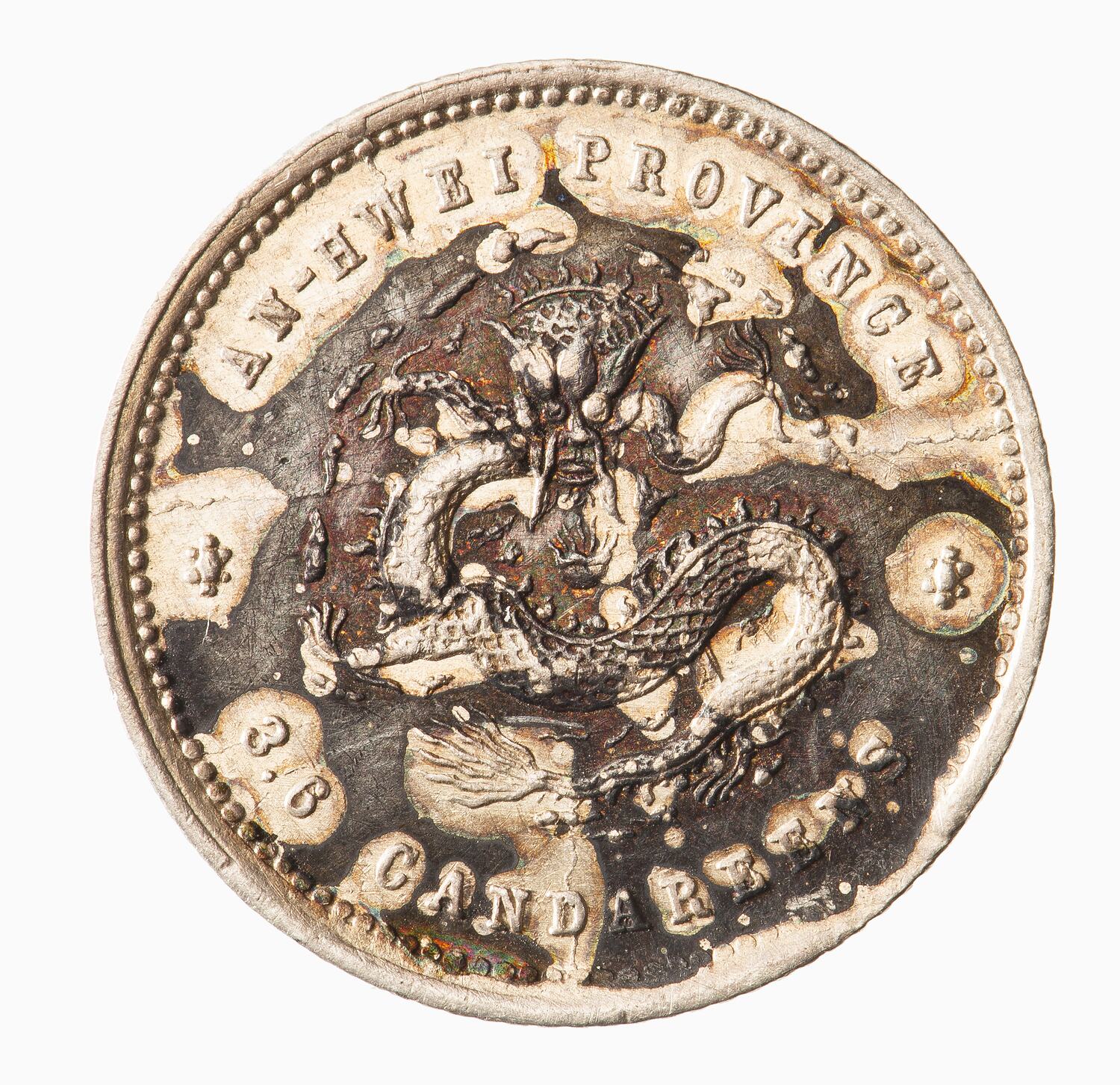 At centre, a dragon facing; around above, AN-HWEI PROVINCE; around below, 3.6 CANDAREENS