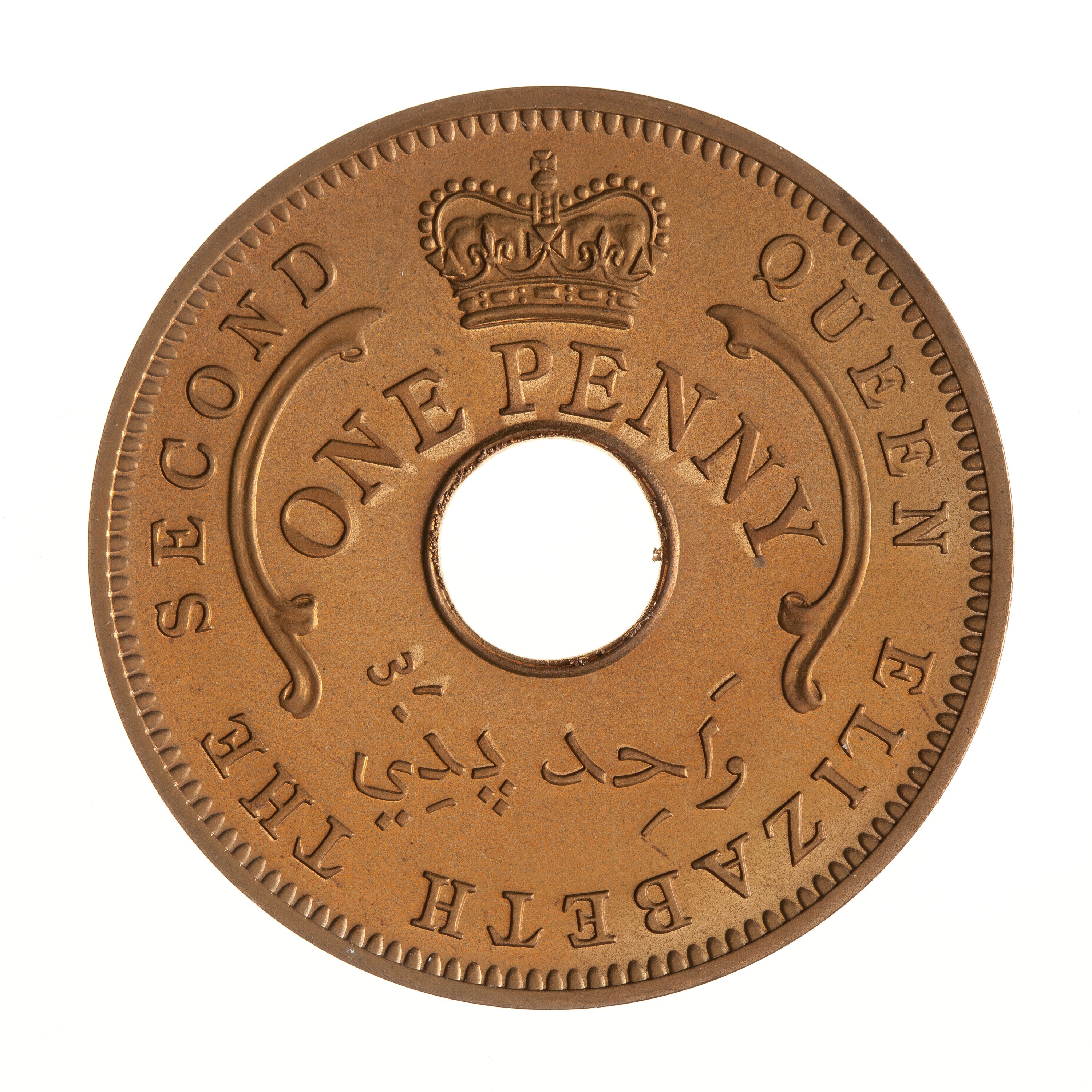 Around above central hole, ONE PENNY; above denomination, a crown; below hole the denomination in Arabic script; around QUEEN ELIZABETH THE SECOND