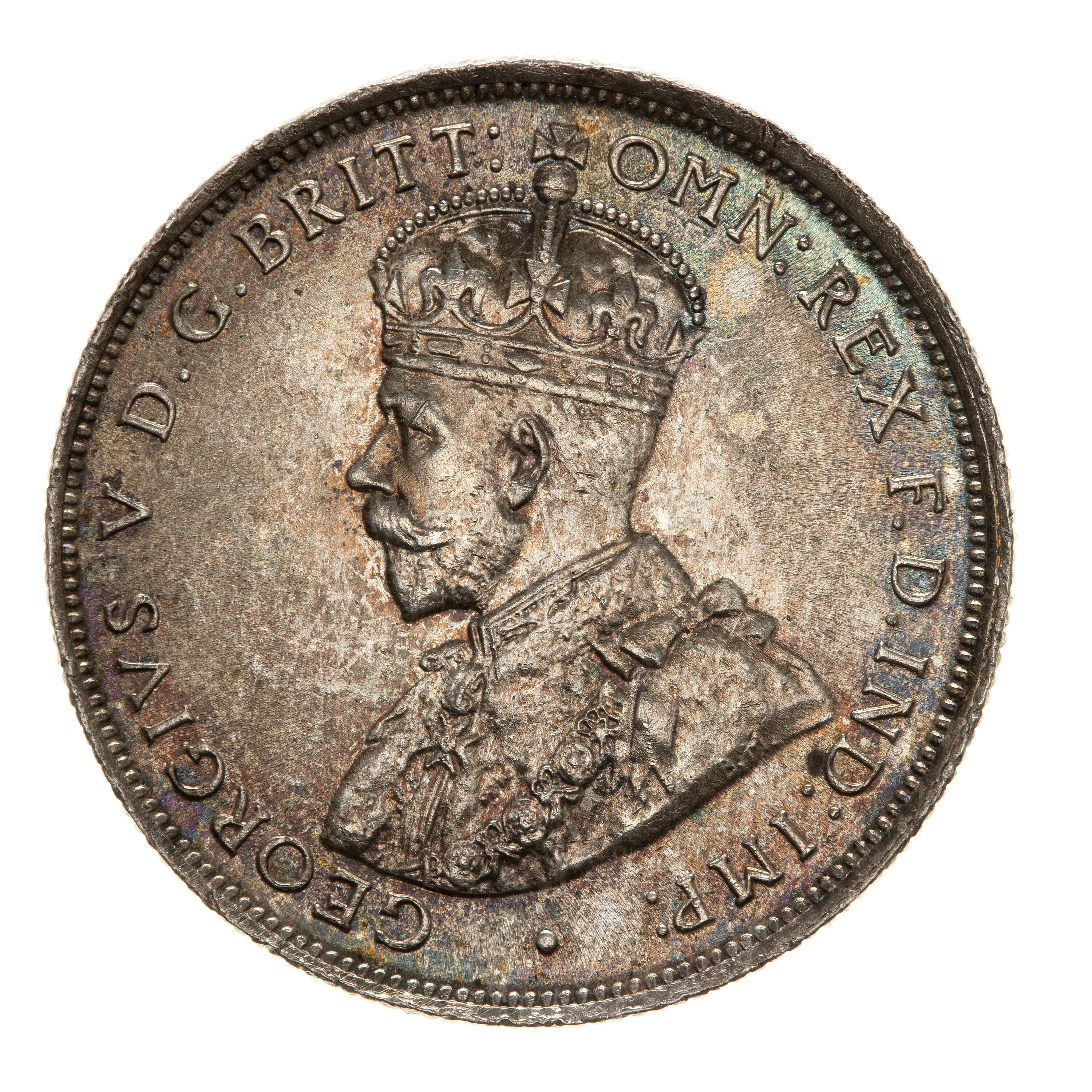 Crowned and draped bust of the King facing left, the King is wearing the Imperial Crown and the ermine Robe of State, the Collar of the Most Noble Order of the Garter, and the Badge of the Most Honourable Order of the Bath; around, GEORGIVS V D.G. BRITT: OMN: REX F.D. IND: IMP:; artist's initials BM on bust truncation
