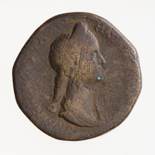 Orichalcum Sestertius of the Emperor Hadrian struck in the name of his wife Sabina between 117 and 136 AD, Ancient Roman Empire. Minted by Rome. The surfaces of both sides of this piece have been scratched, probably the result of harsh wire brushing.