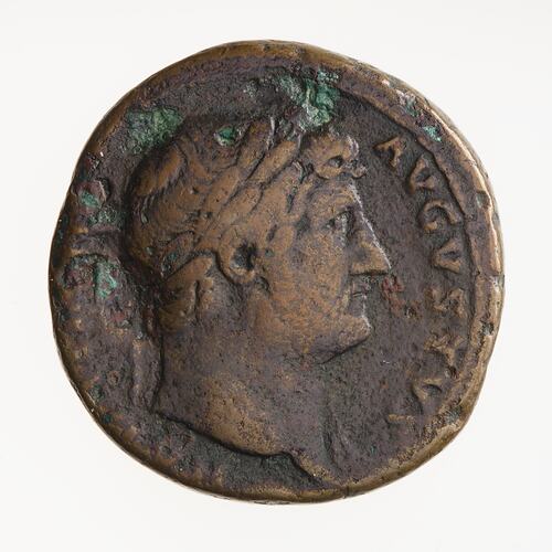 Laureate bust of Hadrian facing right, drapery on left shoulder; around, HADRIA[NVS] AVGVSTVS