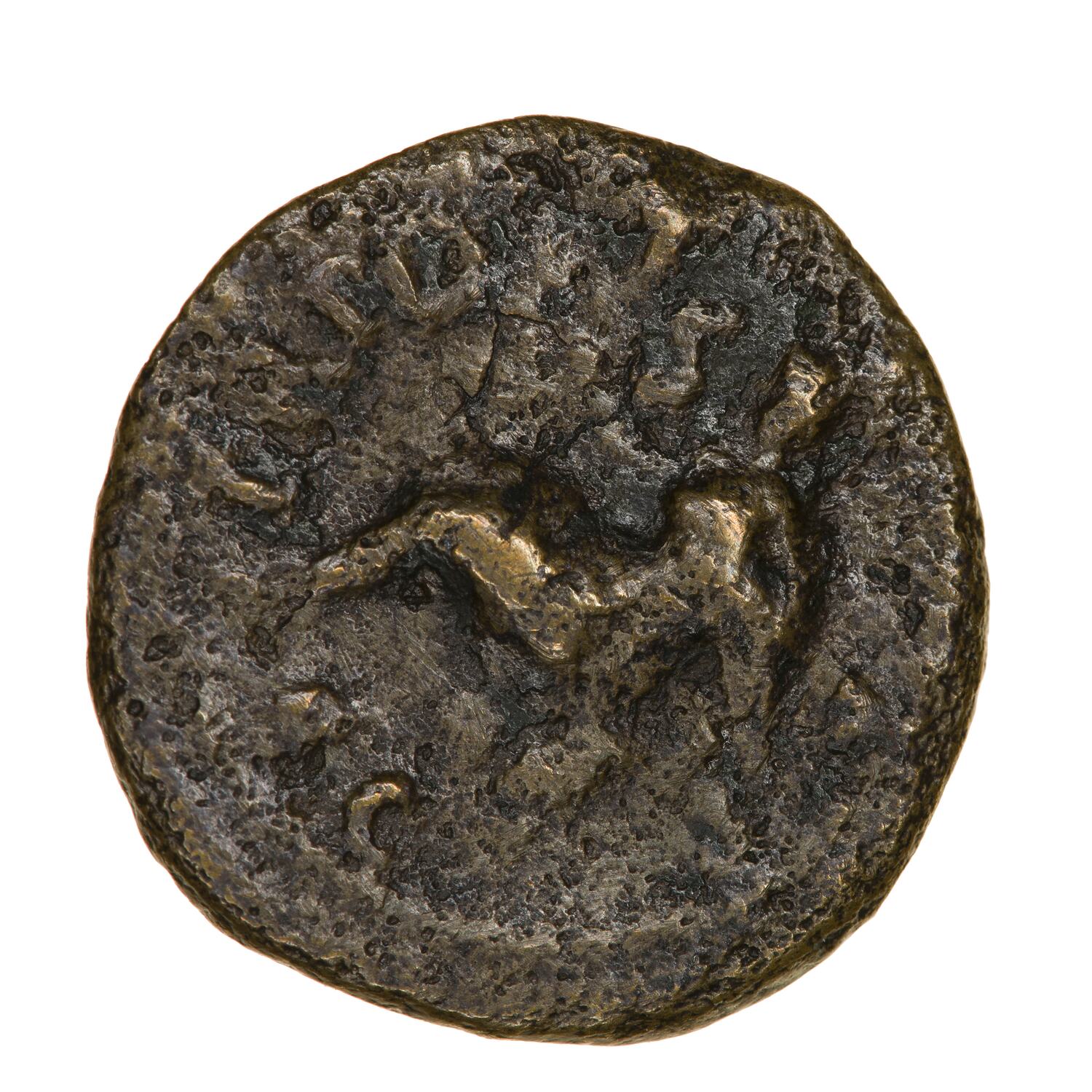Semis issued by the Emperor Nero probably in 64 AD depicting Roma seated. Minted by Rome, Ancient Roman Empire. The coin is quite worn with the reverse legend mostly lost. Although worn, the denomination mark "S', for semis, can be seen on the reverse