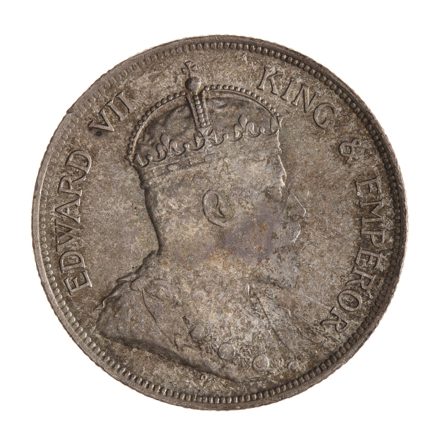 Bust of the King wearing the Imperial crown and an ermine robe with the collar of the Garter; around, EDWARD VII KING & EMPEROR; the artist's initials DES below bust