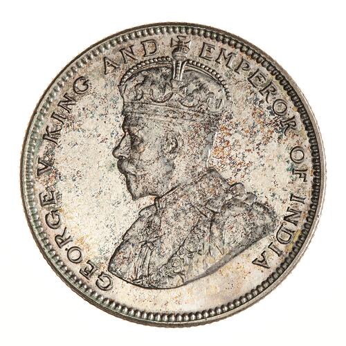 Crowned and draped bust of the King facing left, the King is wearing the Imperial Crown and the ermine Robe of State, the Collar of the Most Noble Order of the Garter, and the Badge of the Most Honourable Order of the Bath; around, GEORGE V KING AND EMPEROR OF INDIA; on bust truncation, the artist's initials, BM