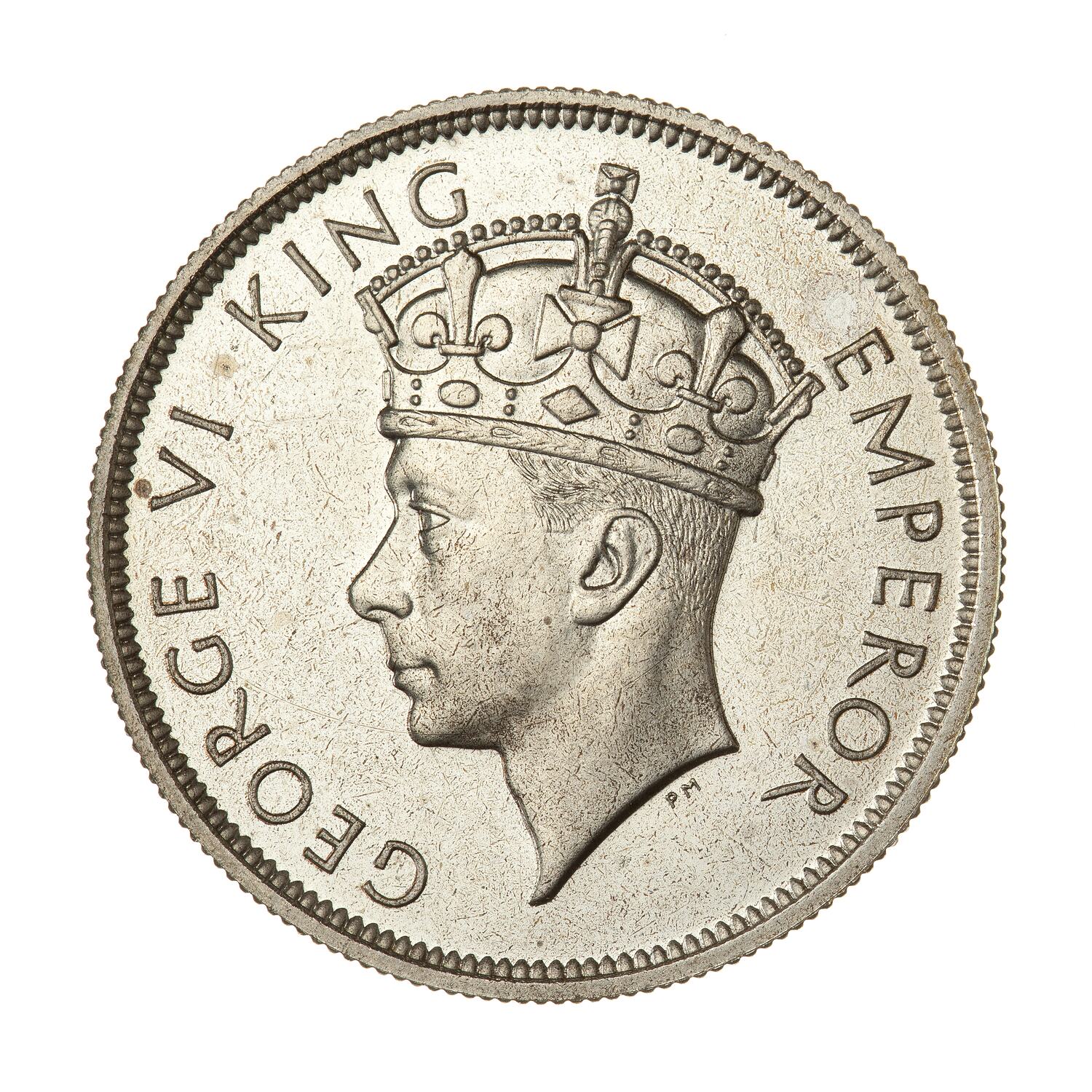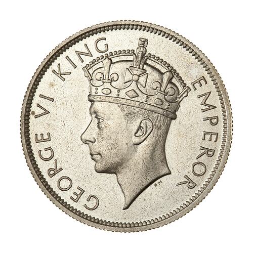 Crowned bust of the King facing left; around, GEORGE VI KING EMPEROR; artist's initials, PM, below neck truncation