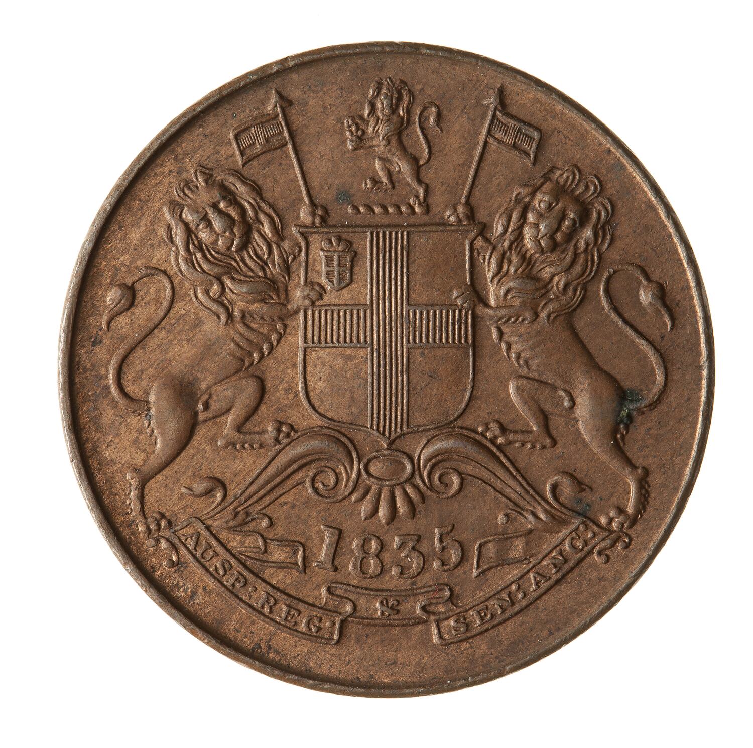 East India Company arms, a shield quartered with eschutcheon of France and England in the first quarter; crest of a lion rampant guardant holding between his forepaws the imperial crown proper; with supporters two lions rampant guardant each supporting a banner charged with a cross; below on a ribbon the motto, 'AUSP: REG: & SEN: ANG:' (translation: under the auspices of the king and senate of England); above ribbon, '1835'.