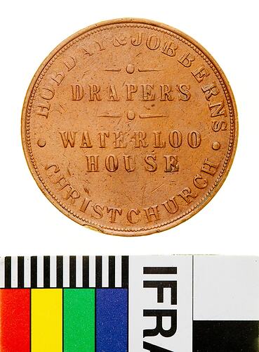 A round copper token (34 mm diameter). The piece features the name, address and business of the issuer: Hobday & Jobberns, Waterloo House, Christchurch, Drapers. The reverse features a shield set above a ribbon with the motto ADVANCE CANTERBURY. The top third of the shield depicts a railway line emerging from a tunnel (damage to the tunnel opening on the die has led some to add varieties, rejected here). Below are argicultural symbols - a wheat sheaf, horse head, cow head and plough. The makers name, STOKES & MARTIN MELBOURNE, in tiny letters around the rim from 07 to 05. This token has been cleaned and varnished.