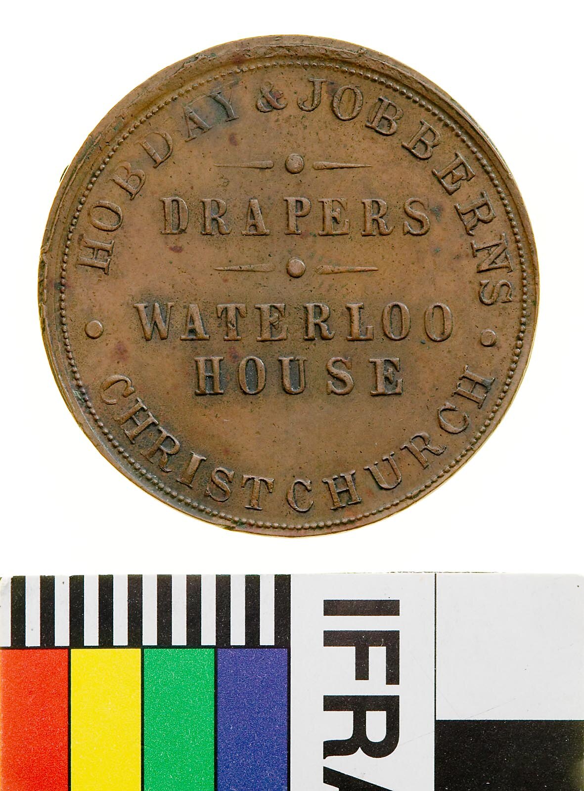 Obverse: HOBDAY & JOBBERNS DRAPERS WATERLOO HOUSE CHRISTCHURCH Reverse: ADVANCE CANTERBURY STOKES & MARTIN MELBOURNE