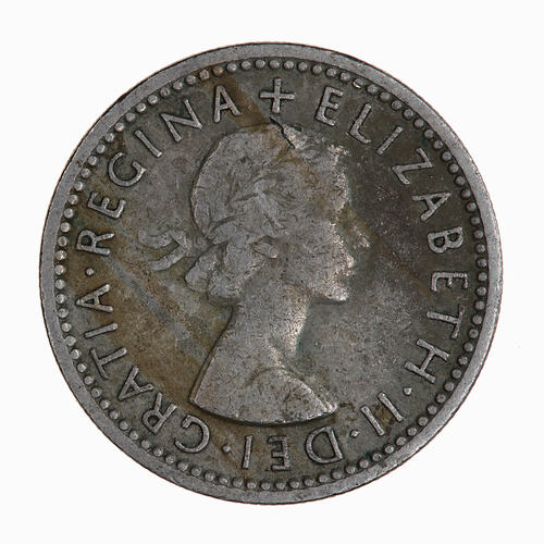 Laureate bust of the Queen facing right; around, + ELIZABETH II DEI GRATIA REGINA