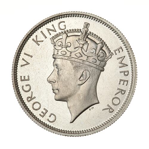 Crowned bust of the King facing left; around, GEORGE VI KING EMPEROR; artist's initials, PM, below neck truncation