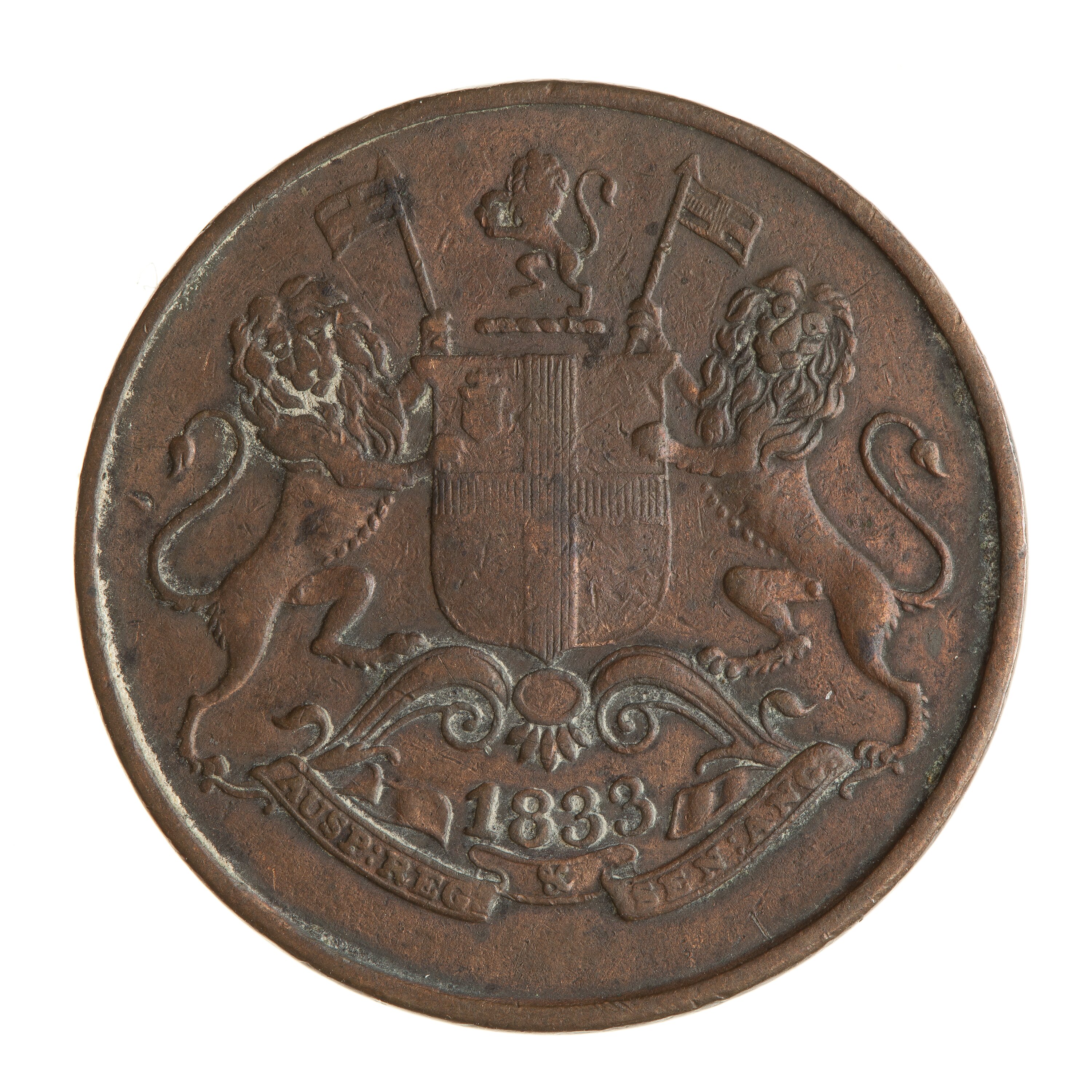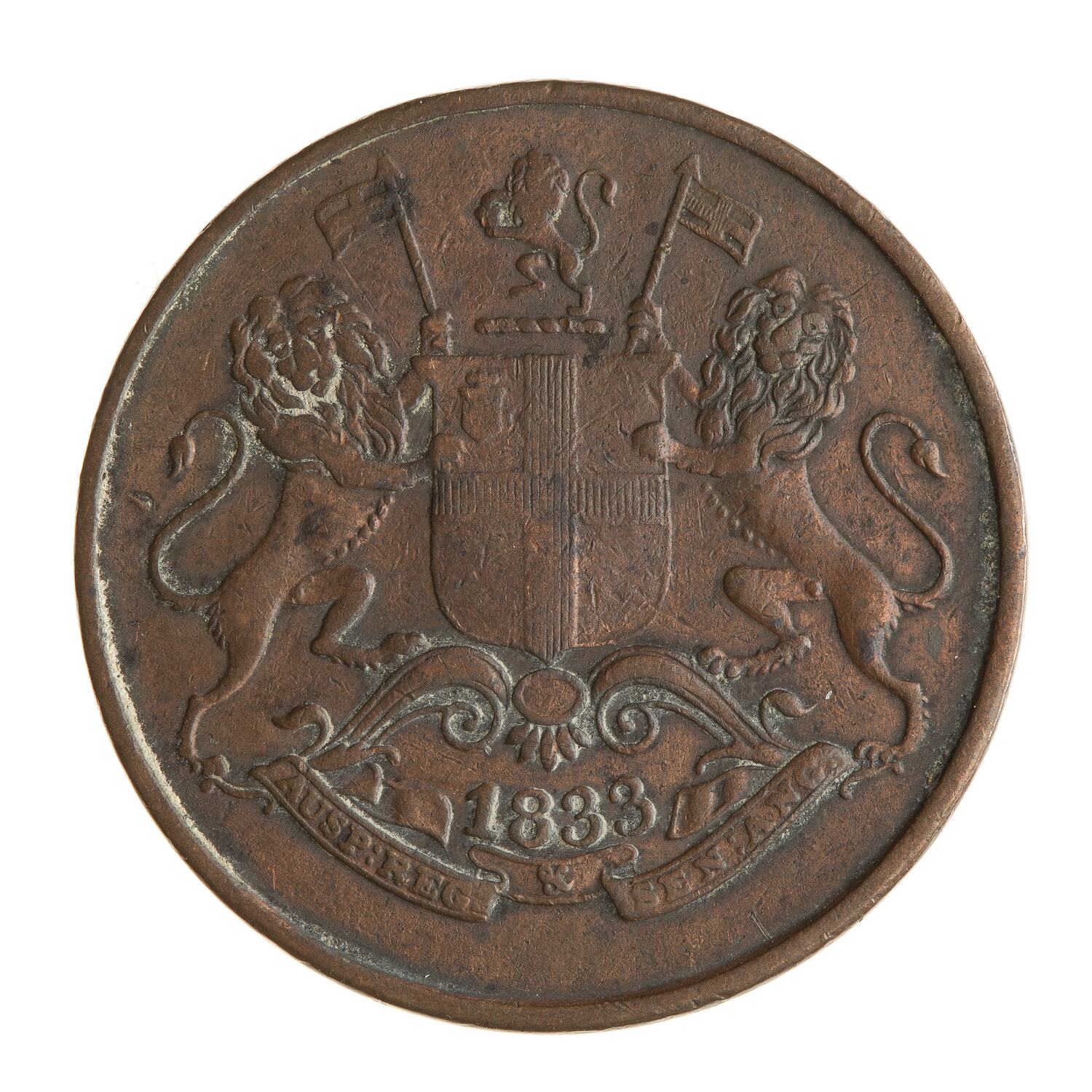 Arms of British East India Company; below shield, 1833