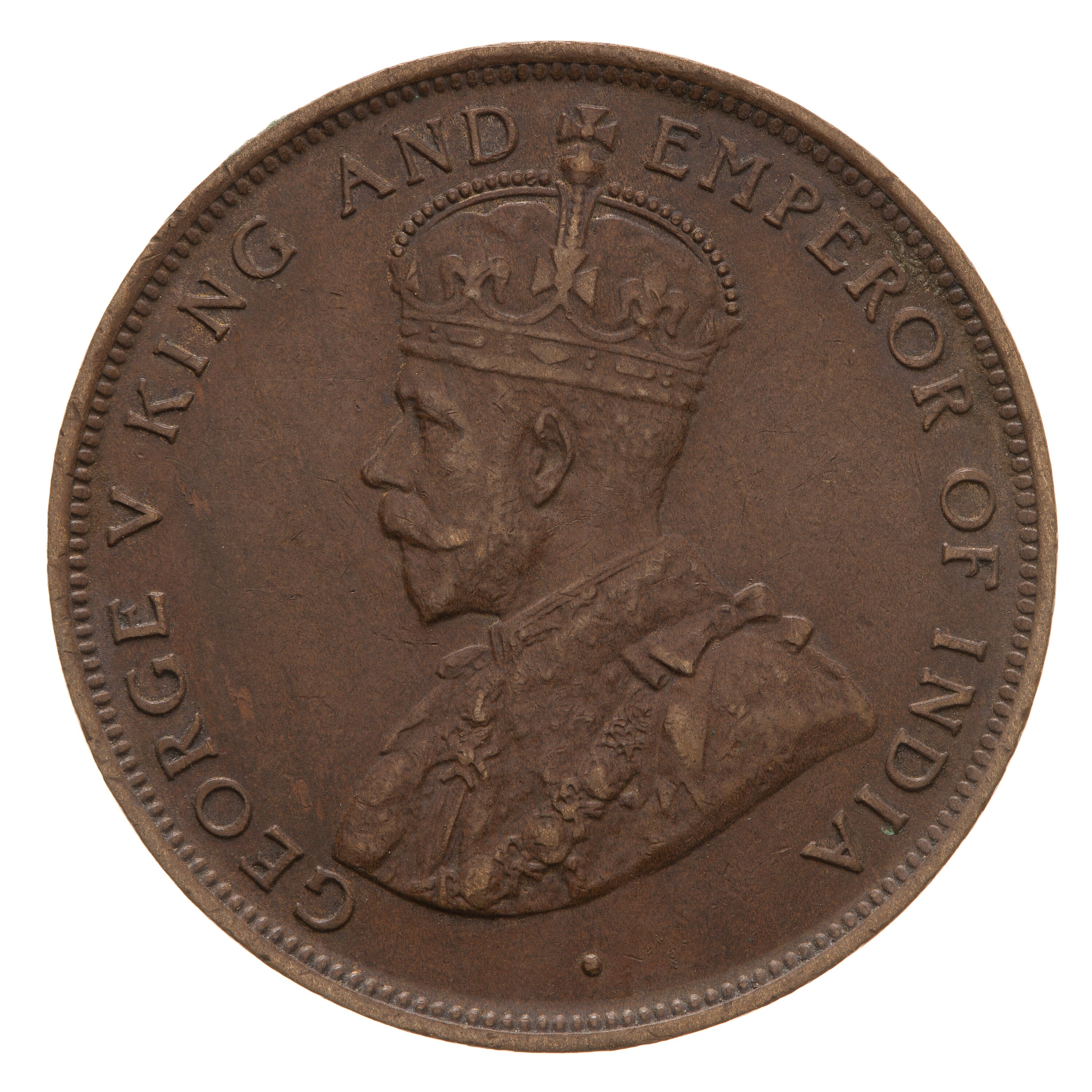 Crowned and robed bust of the King facing left; around, GEORGE V KING AND EMPEROR OF INDIA; on bust truncation in small letters the artists initials, BM