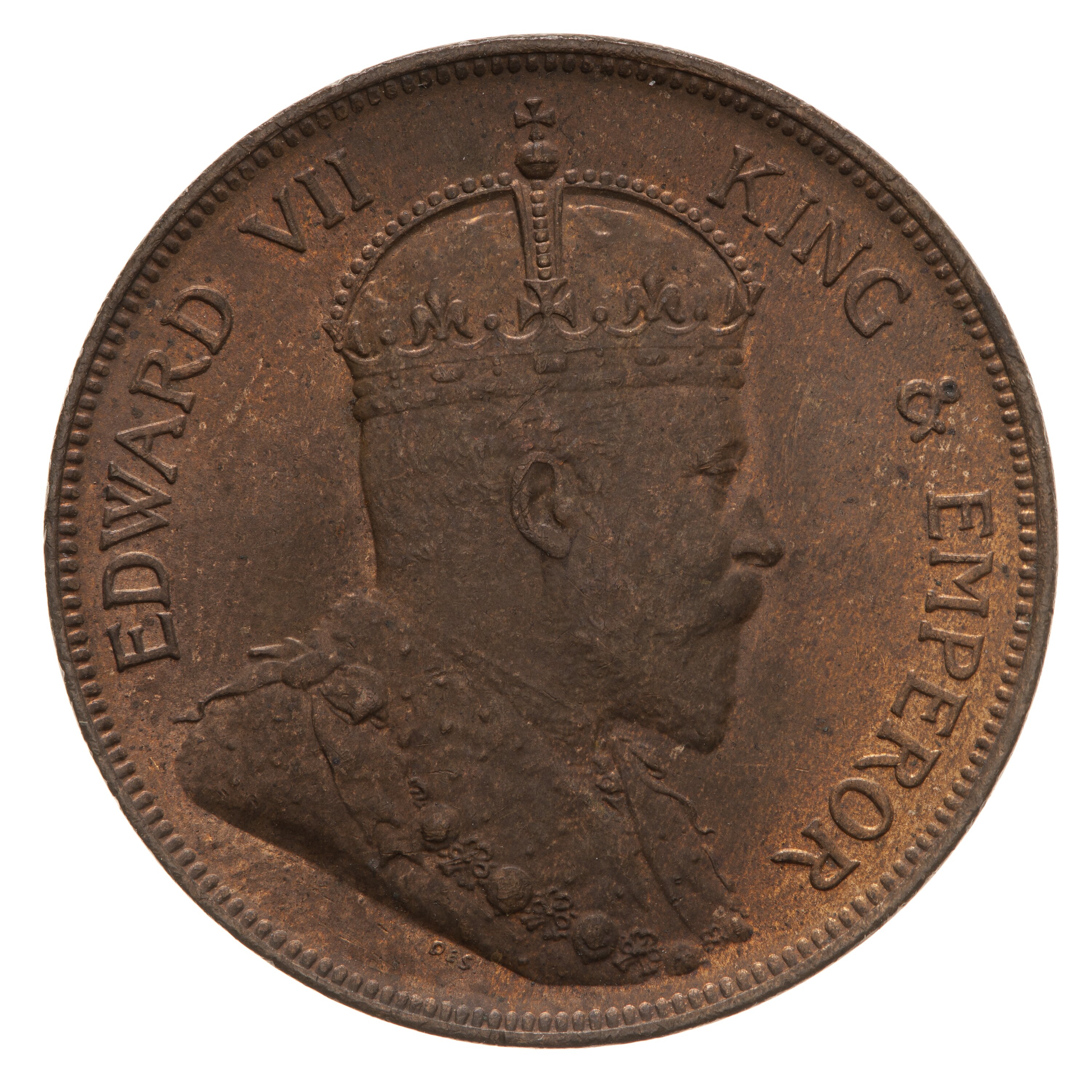 Crowned and draped bust of the King facing right, the King is wearing the Imperial Crown and the ermine Robe of State, the Collar of the Most Honourable Order of the Bath; around, EDWARD VII KING & EMPEROR; below the bust truncation, the artist's initials, DES