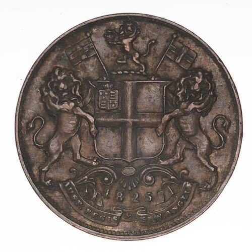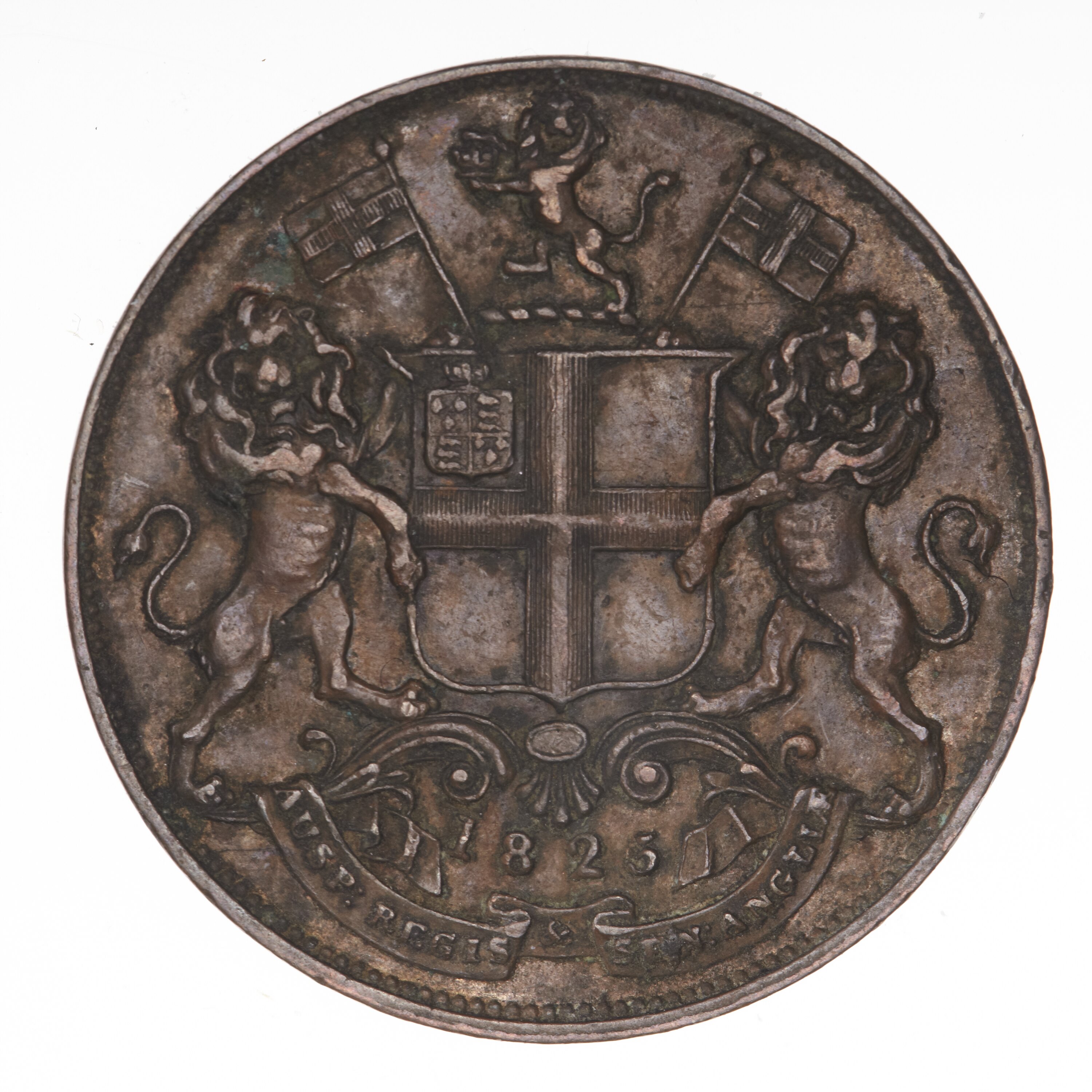 Company arms, a quartered shield (crowned Royal shield in the first quarter of the shield else plain); crest of a helm with lion holding the Imperial Crown; lion supporters, each holding a banner charged with a cross motto below on ribbon, AUSP: REGIS & SEN: ANGLIAE (translation: under the auspices of the king and senate of England); above motto, 1825