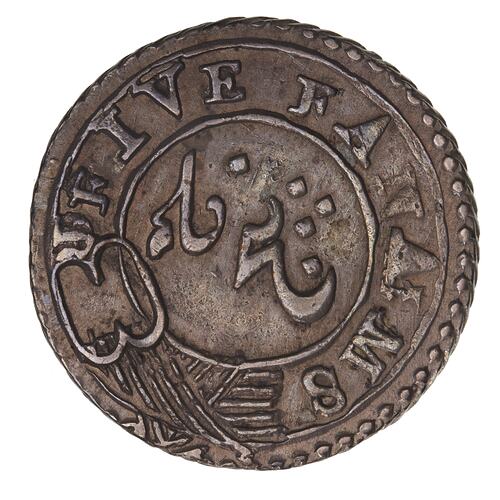 At centre, the denomination in Persian; around on buckled garter, FIVE FANAMS
