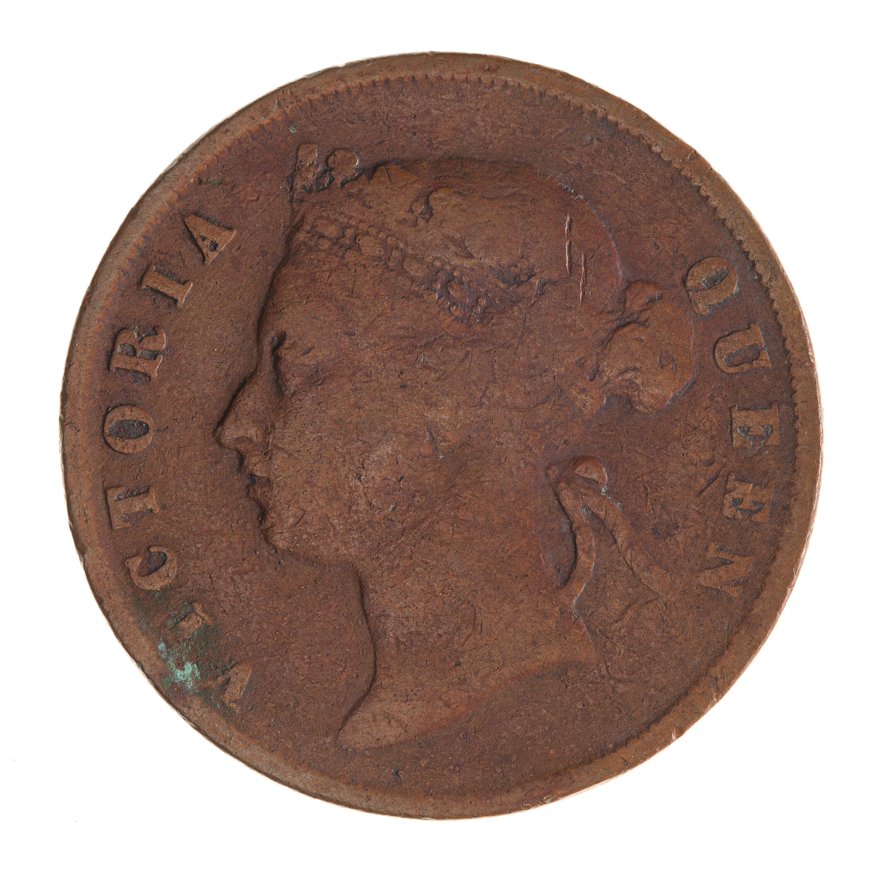 Head of the Queen, wearing coronet or diadem ornamented with jewels, facing left; around, VICTORIA QUEEN. The ends of the coronet are connected by a band decorated with a scroll which is partly hidden by the hair. The hair is drawn into a knot behind the head and teied with a bow at the back of the head.