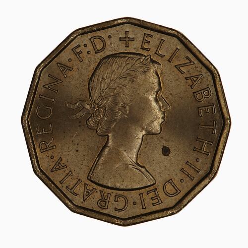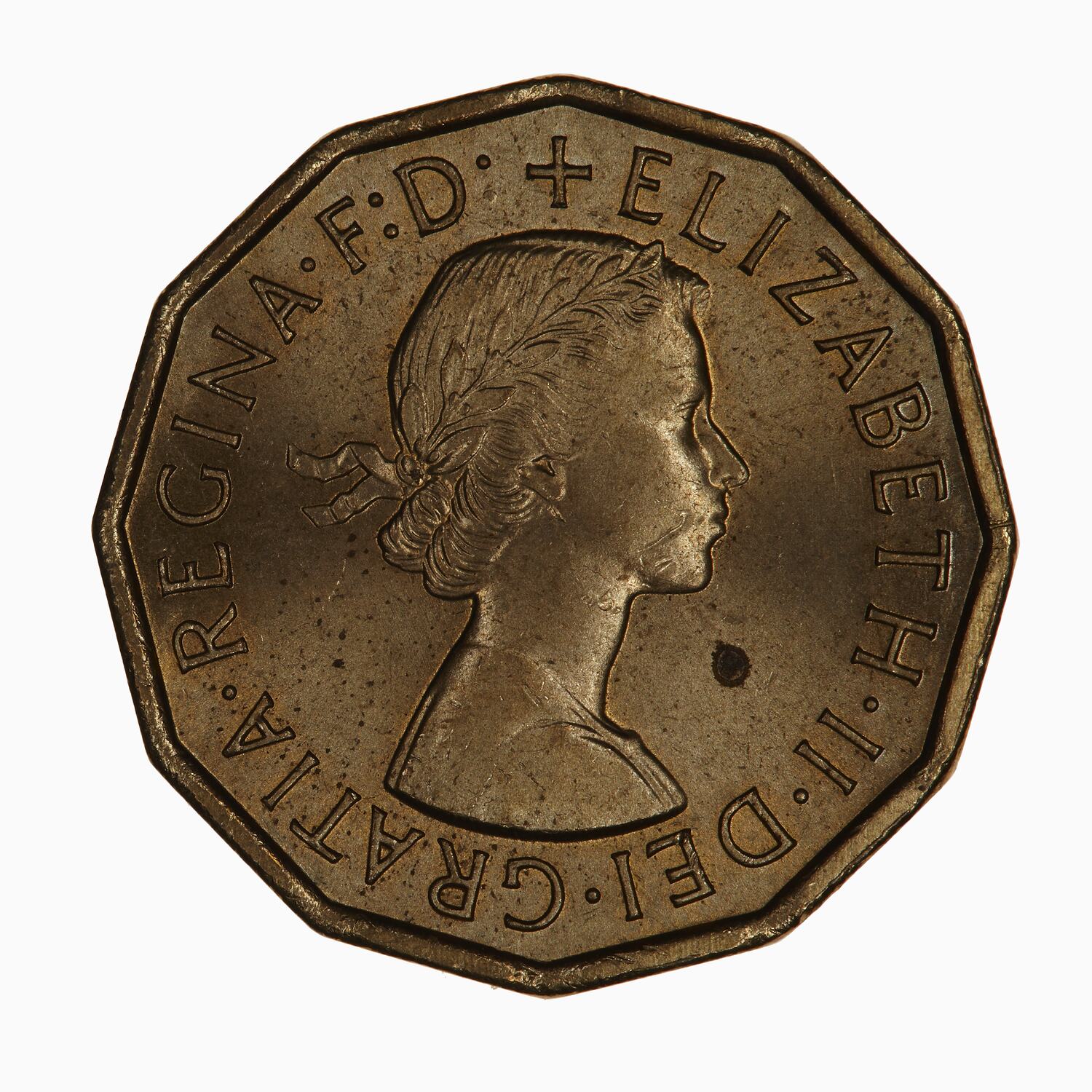 Crowned portcullis; below in small letters the artist's initials WG (William Gardner); around below, THREE 1966 PENCE