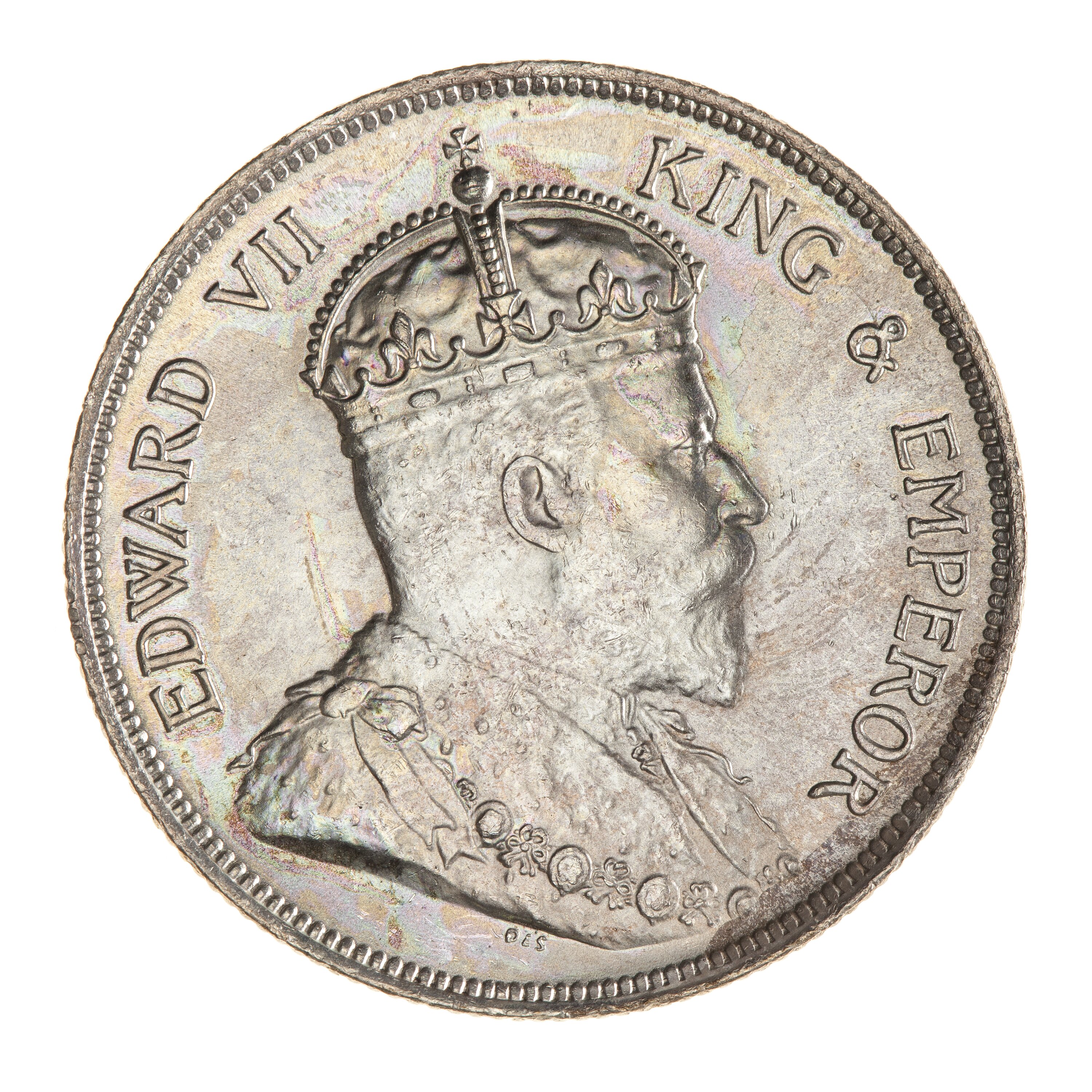 Bust of the King wearing the Imperial crown and an ermine Robe of State with the Collar of the Most Honourable Order of the Bath; around, EDWARD VII KING & EMPEROR; the artist's initials DES below bust