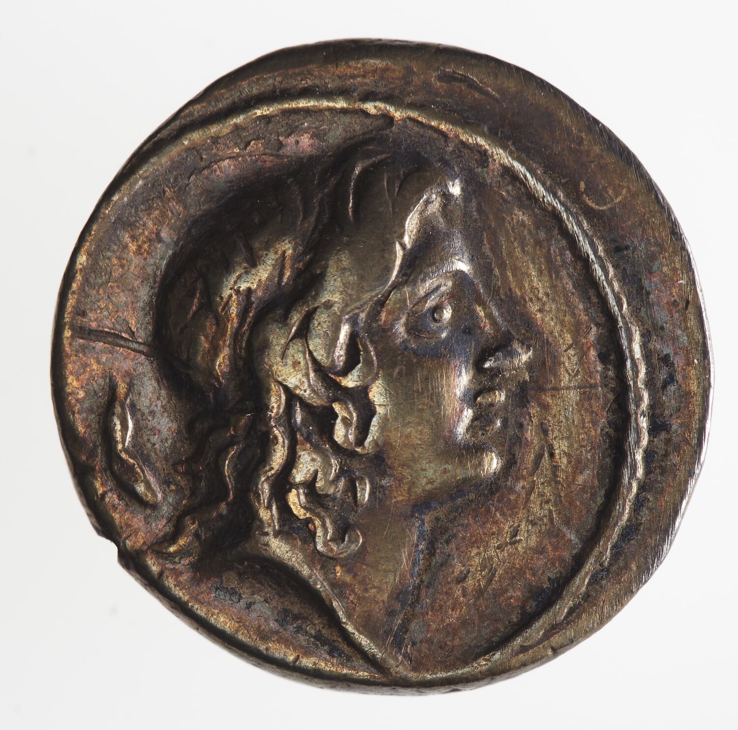 Male head with flowing hair facing right; behind, the control-mark sickle (?)