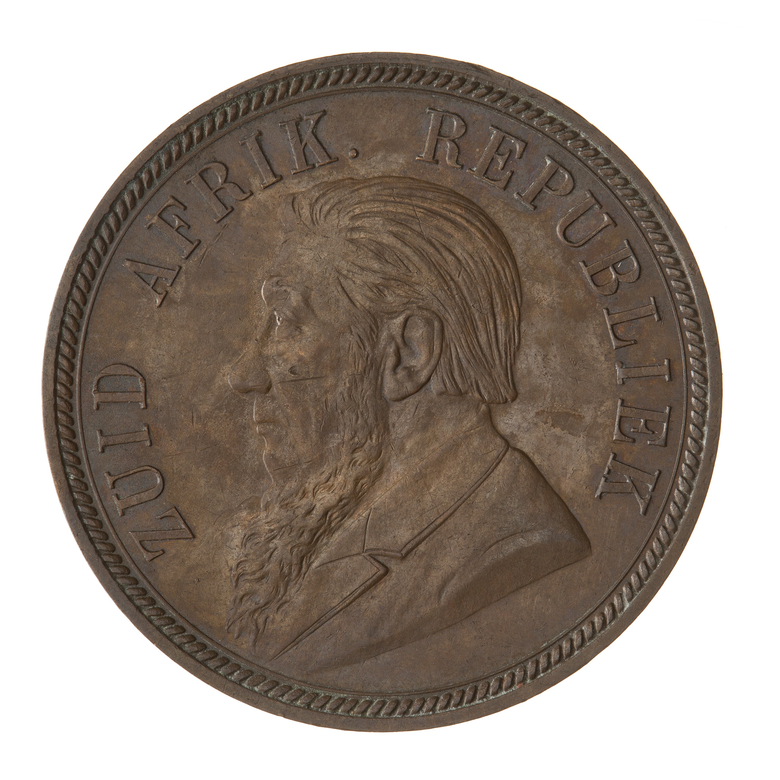 Draped bust of President Paul Kruger facing left; around, ZUID AFRIK. REPUBLIEK