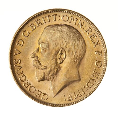 Bare head of George V left; around, GEORGIVS V D.G. BRITT: OMN: REX F:D: IND: IMP:
